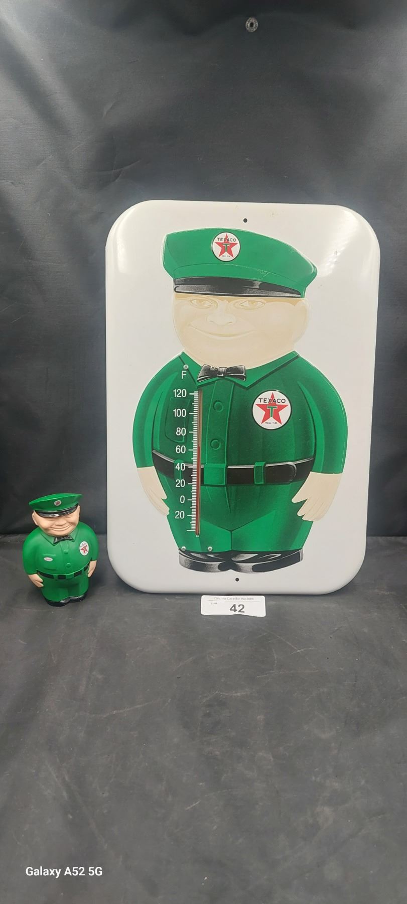 2 pieces of mint condition Texaco collectables Thermometer and bank 97 and 98