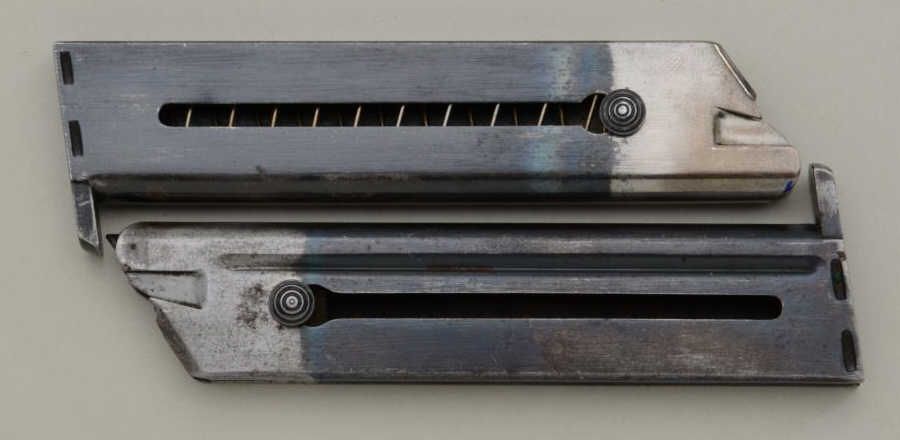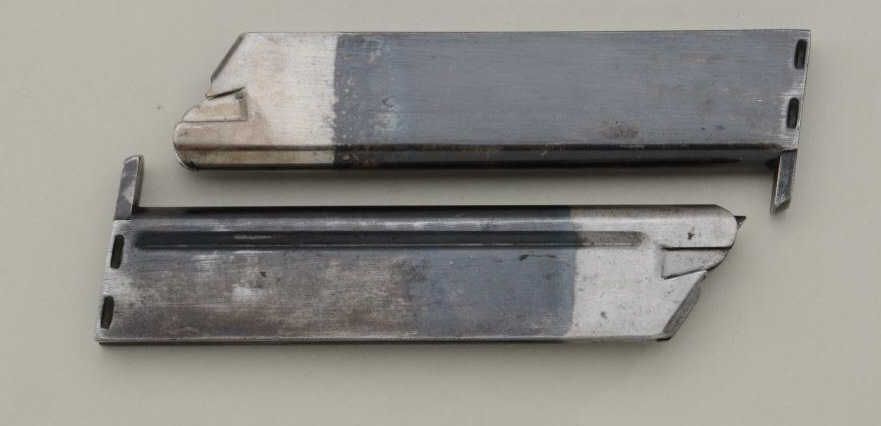 2 pre-war Colt Woodsman clips. One shows large caliber .22 Colt marking with grooved back and two-tone finish and the other is also two-tone with small letters and solid back. Est.: $200-$400