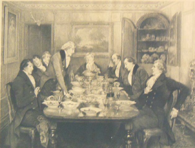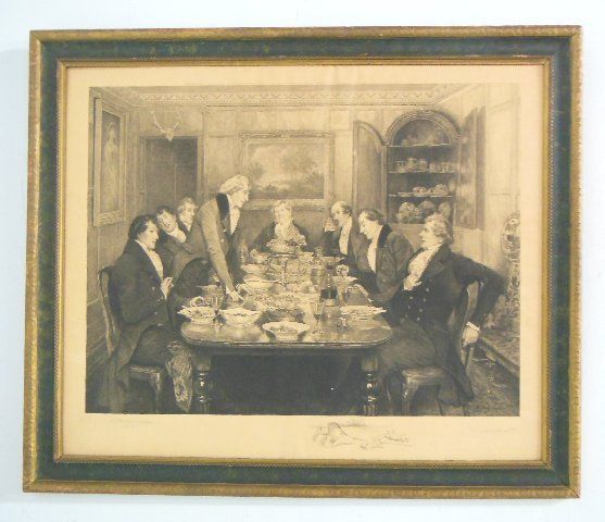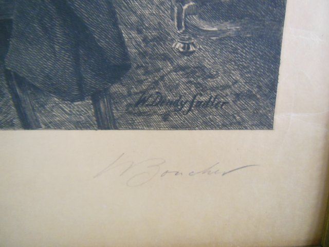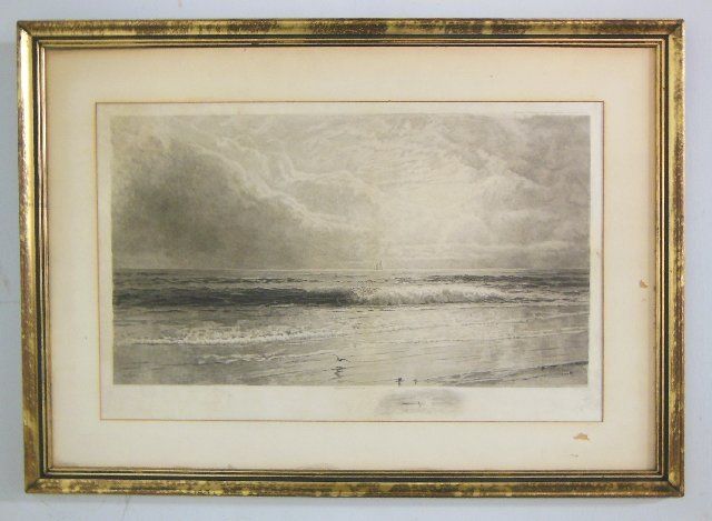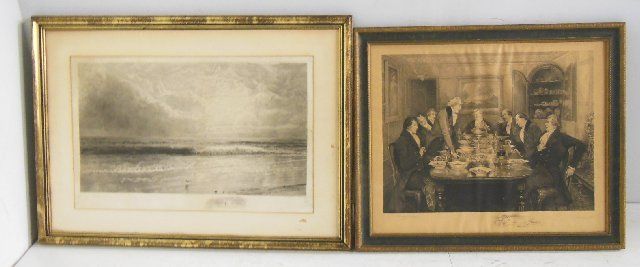 1- 19th c. engraving signed W.D. Sadler, "Gentleman at Table", framed, lacking glass, approx. 30" x 25". 1- "Seascape", Willian Trost Richards, signed in the plate, framed, lacking glass, approx. 36" x 26".