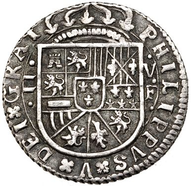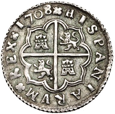 2 reales. 1708. Valencia. F. VI-801. MBC+. Muy escasa en esta calidad.