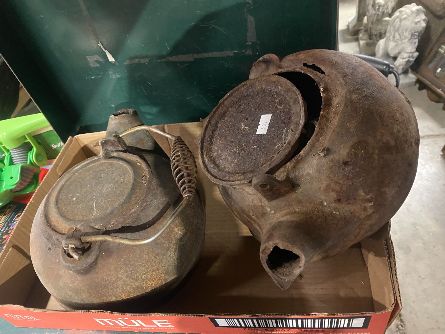 2 rustic cast iron kettles