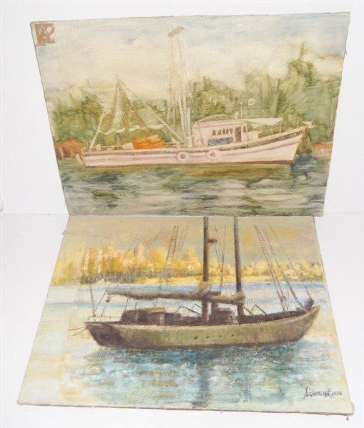 2 sailboat paintings- 1 on board & 1 on canvas glued on board both signed Schmidt 1978 & '90. Paint loss. 15 1/4 inches x 12 inches.