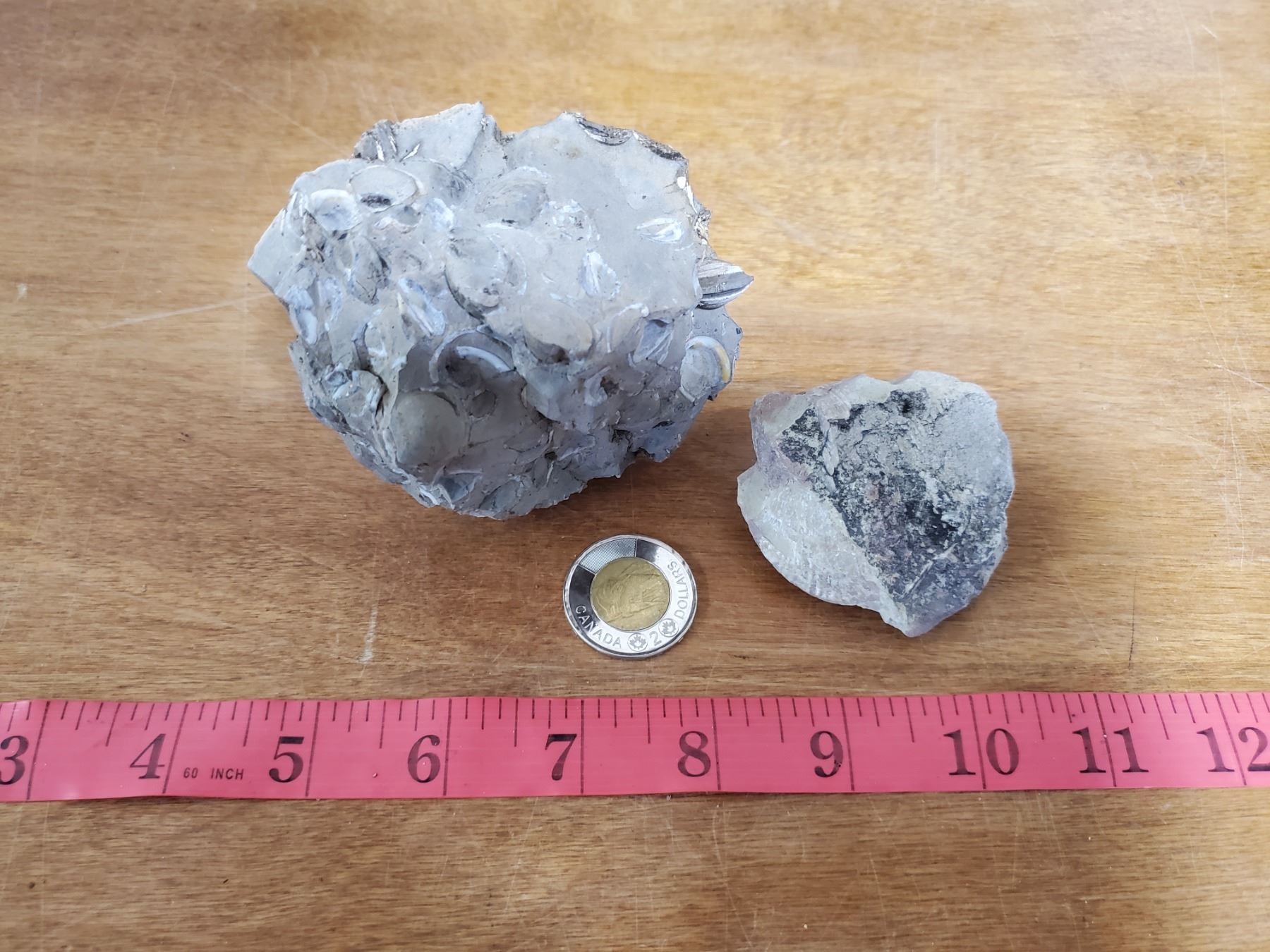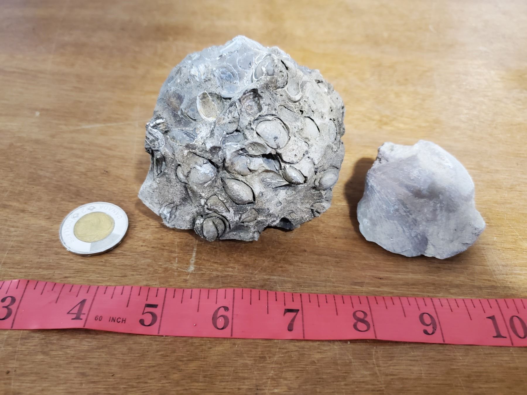 2 sea creature fossils from Southern Saskatchewan -coin for reference only
