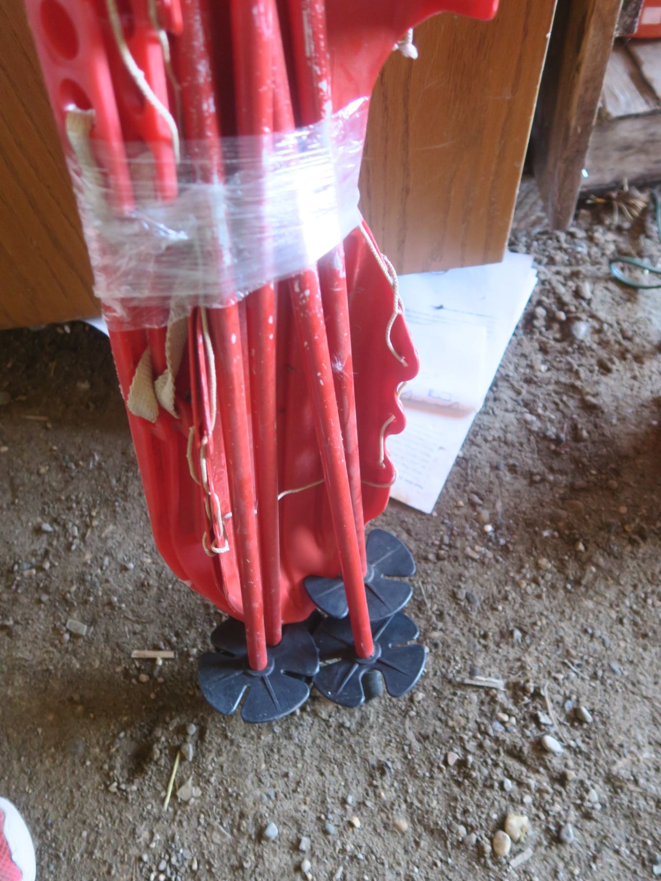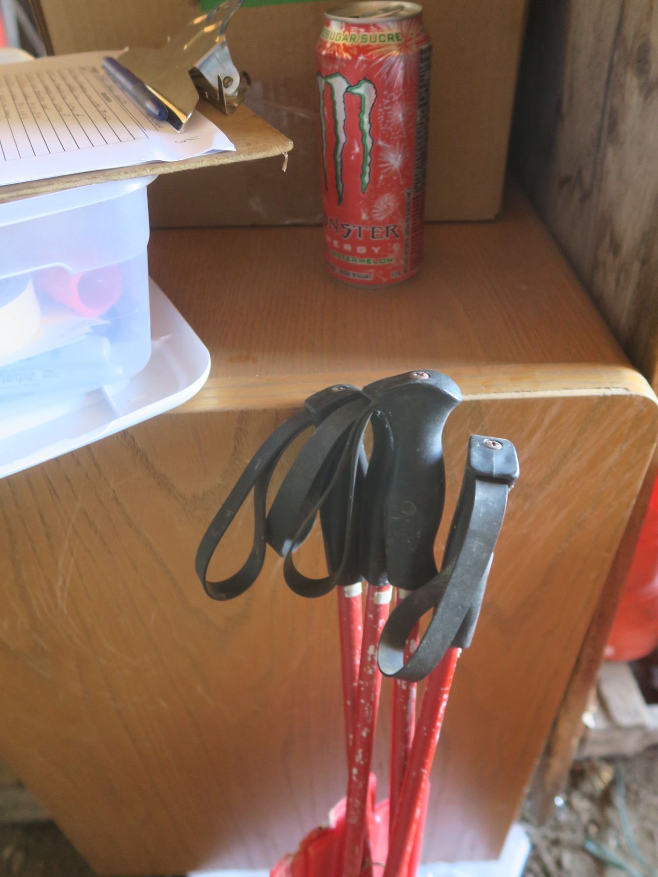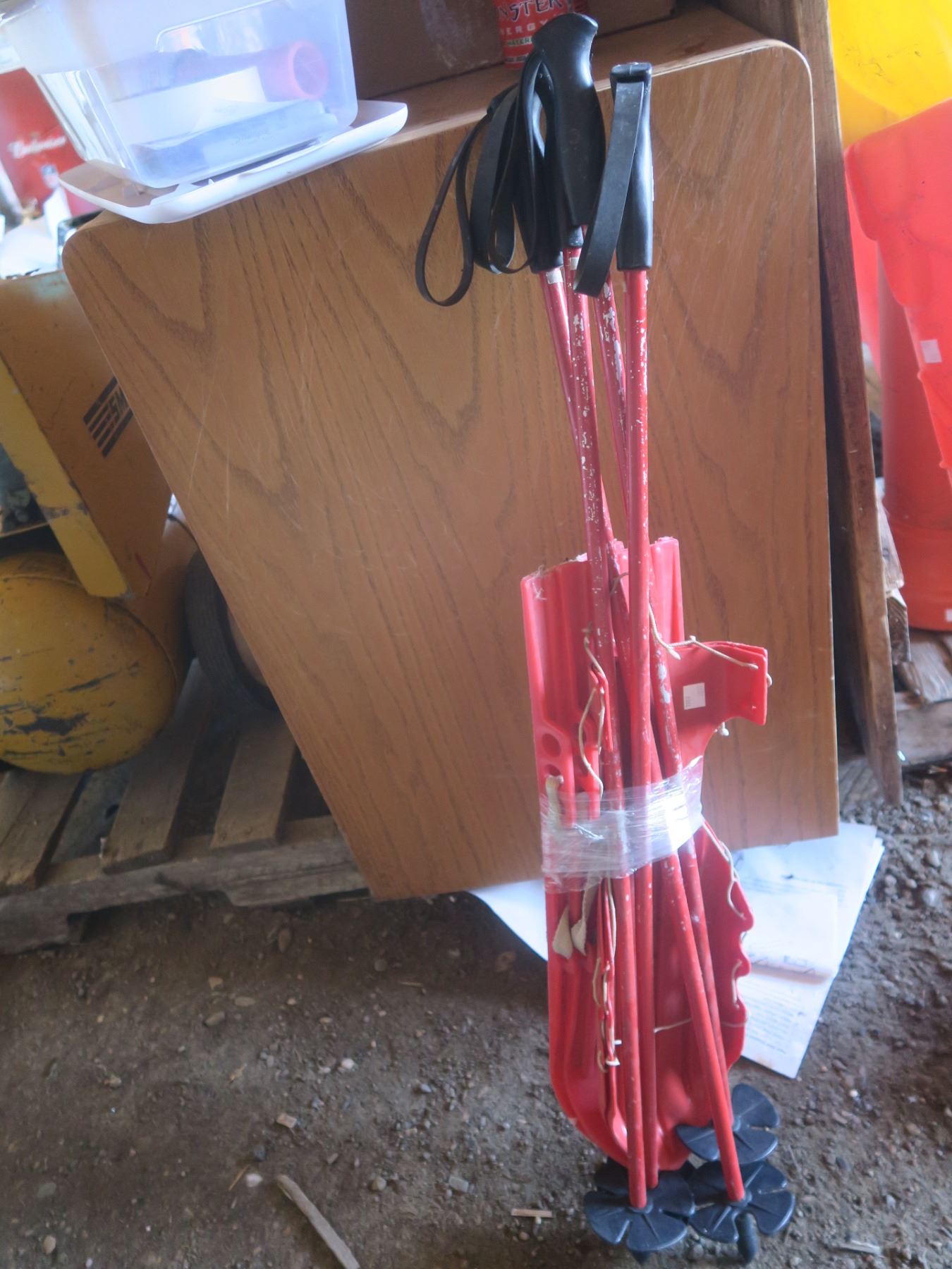 2 sets of red plastic skis with poles