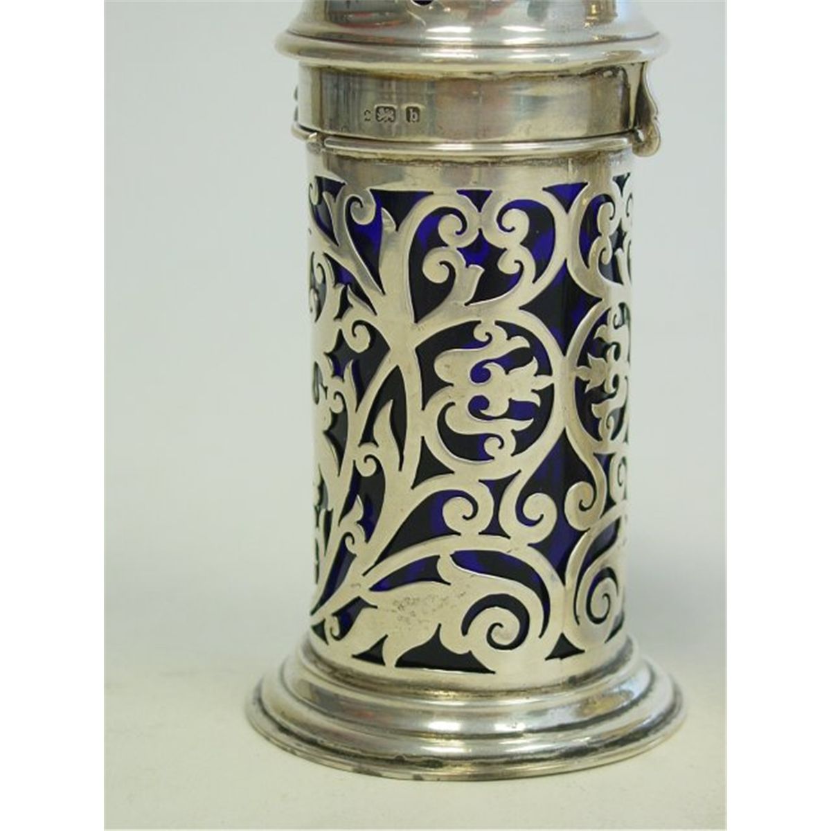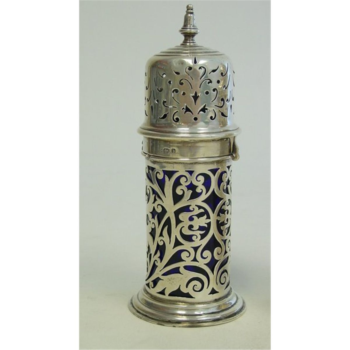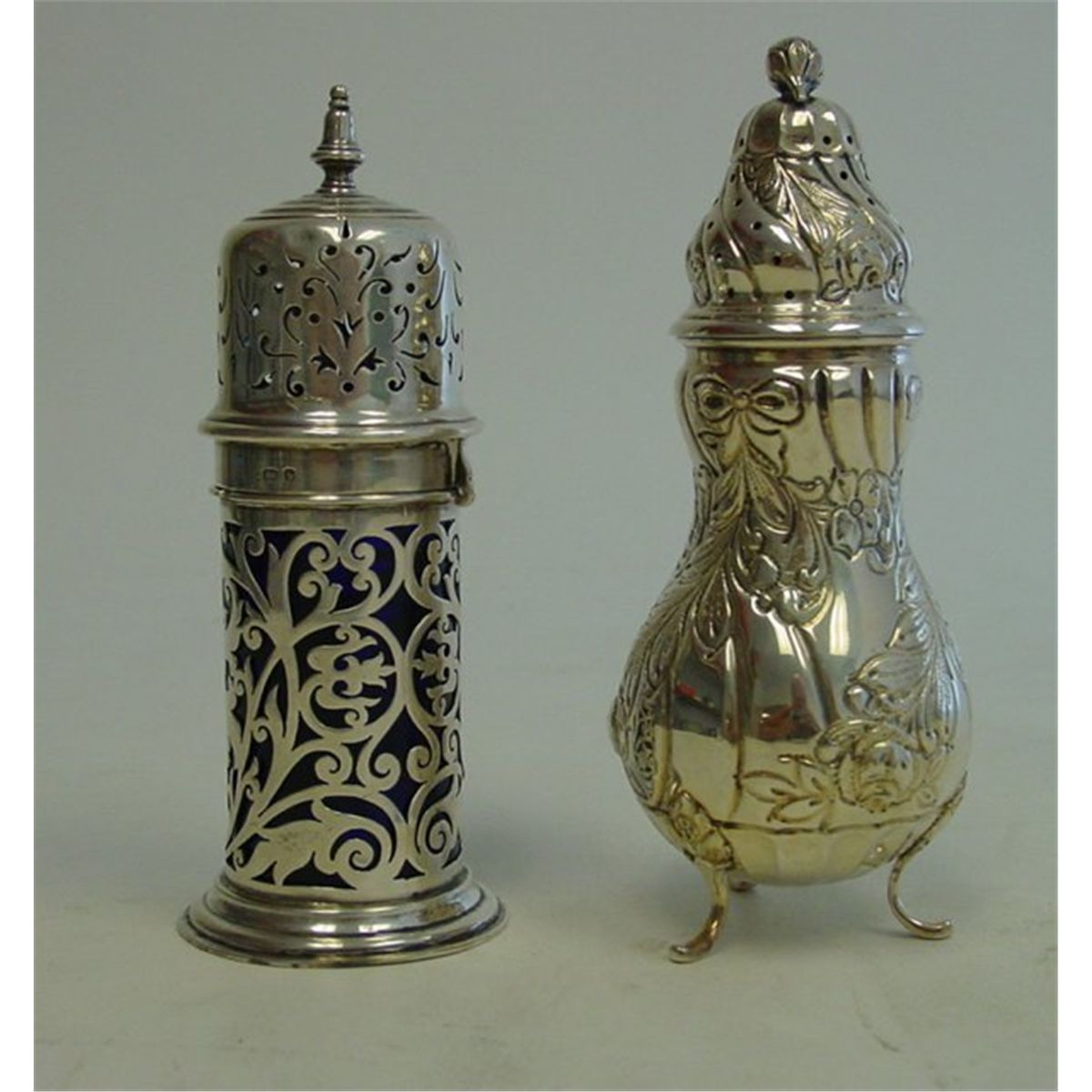 1- English sterling muffineer with cobalt glass liner, hallmarked, approx. 7" H x 2.5" W. 1- Continental silver muffineer, approx. 7" x 3". From a Greenwich, CT estate. Please read our terms of sale.