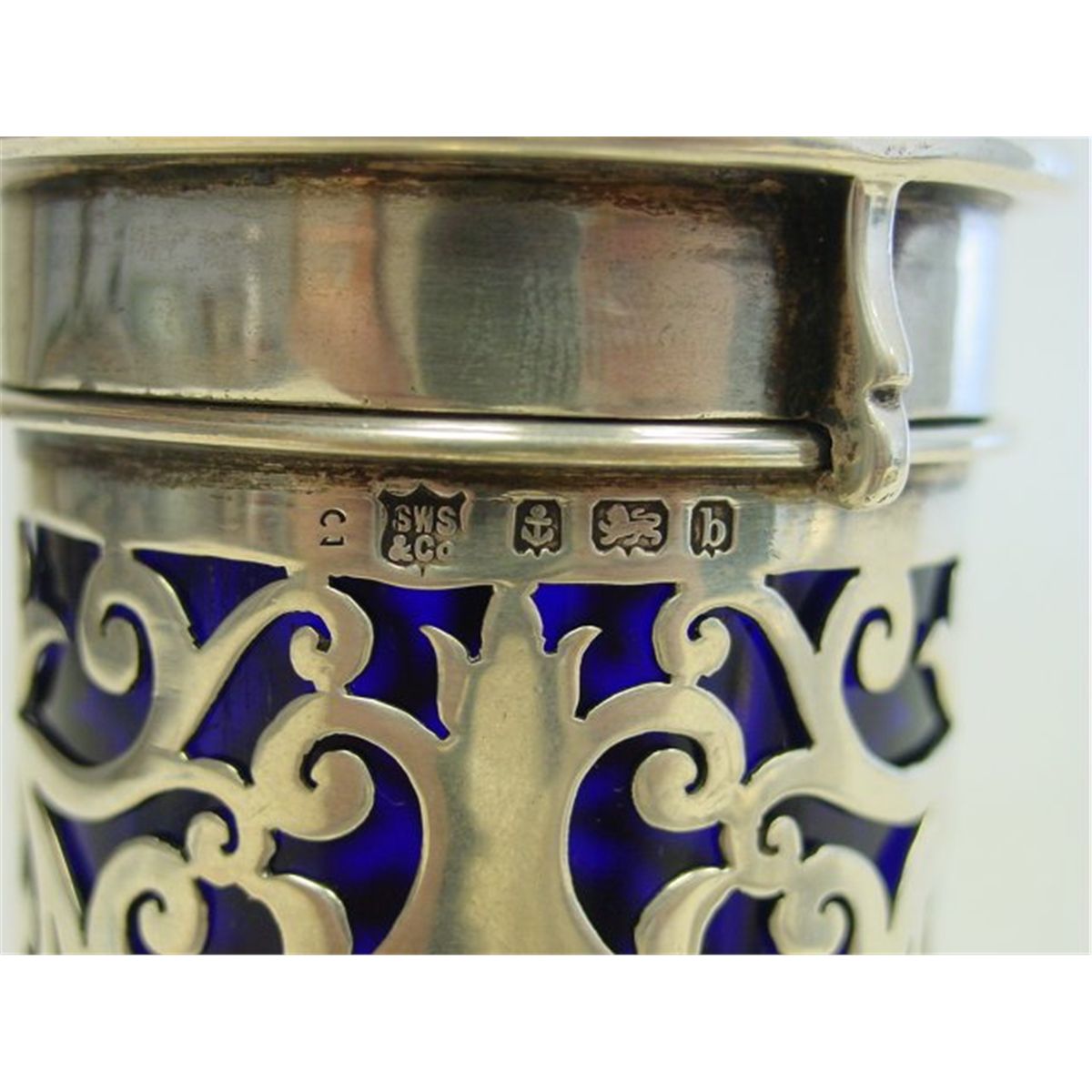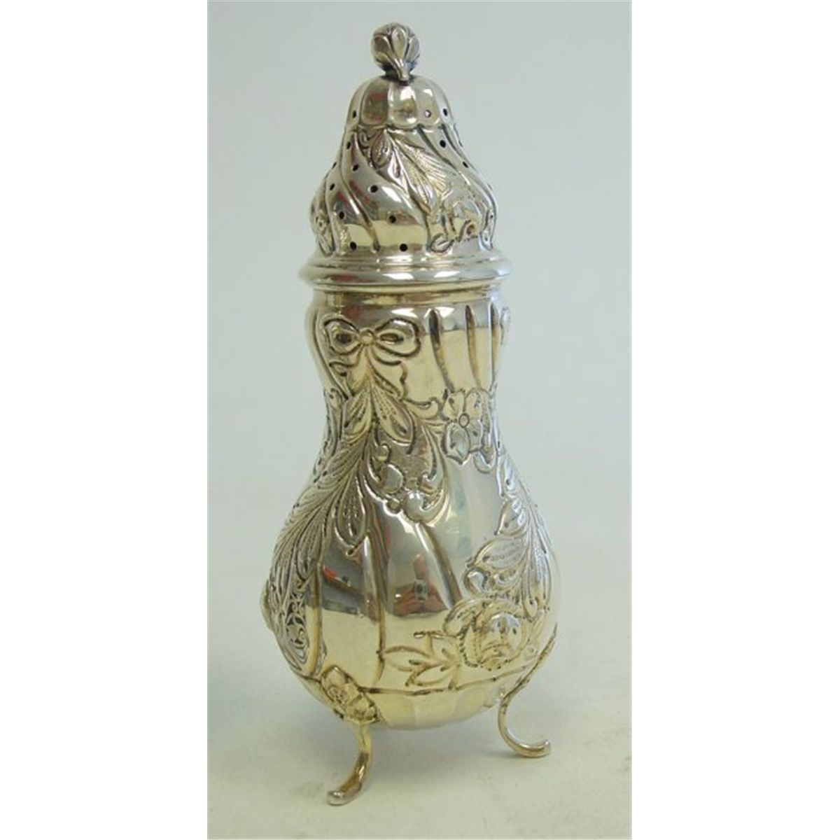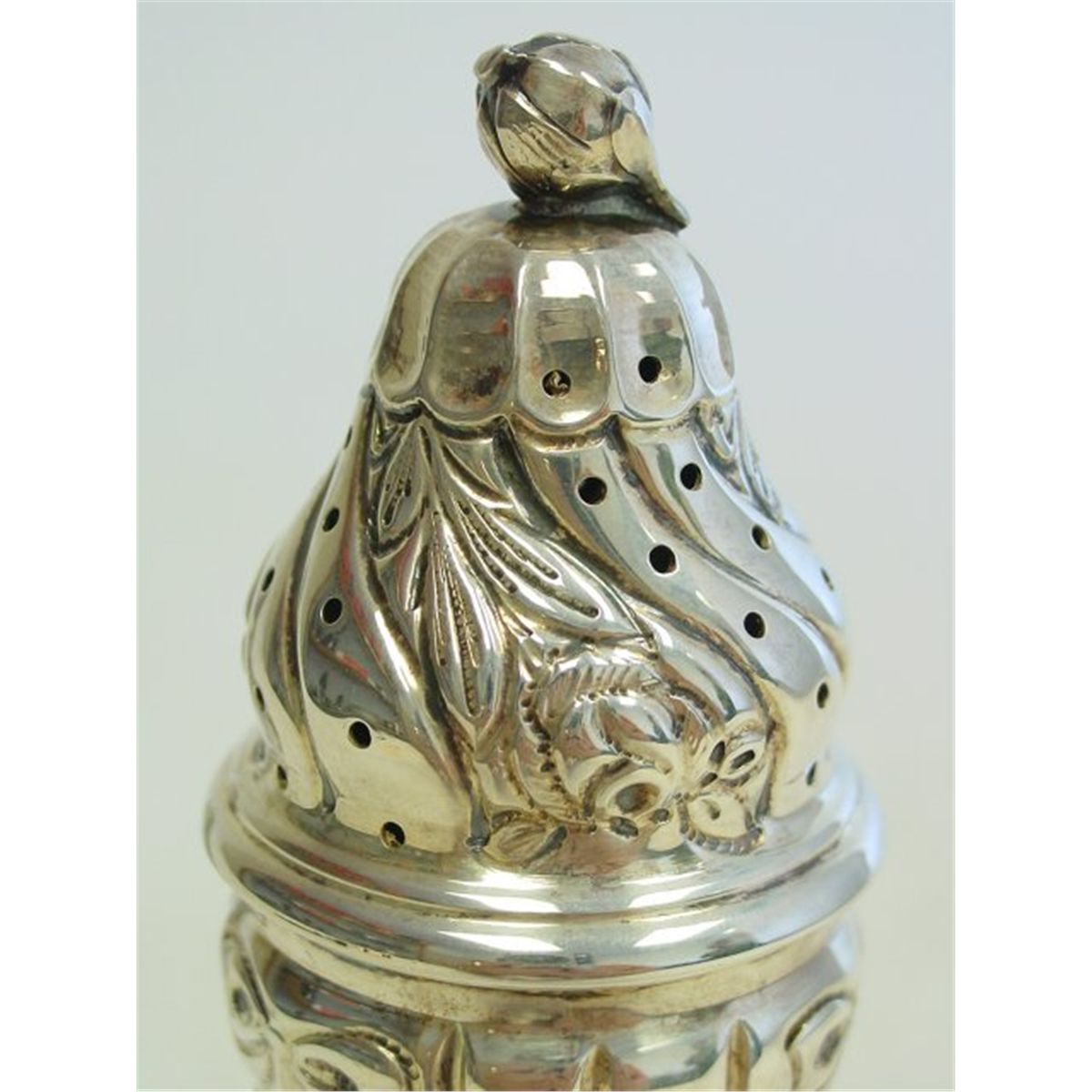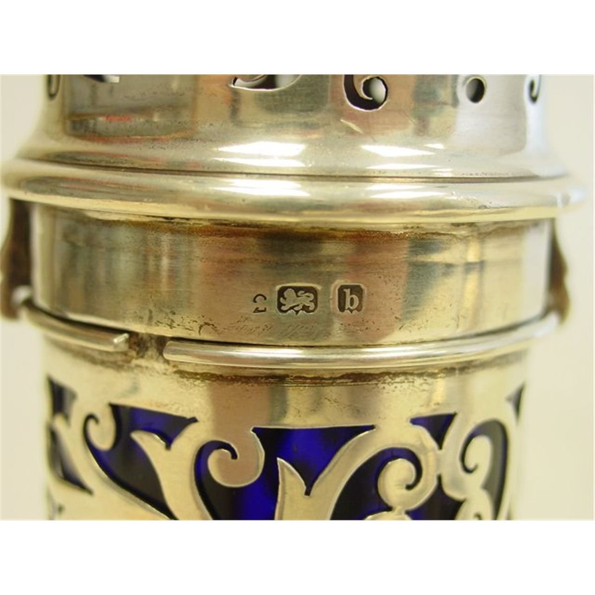 1- English sterling muffineer with cobalt glass liner, hallmarked, approx. 7" H x 2.5" W. 1- Continental silver muffineer, approx. 7" x 3". From a Greenwich, CT estate. Please read our terms of sale.