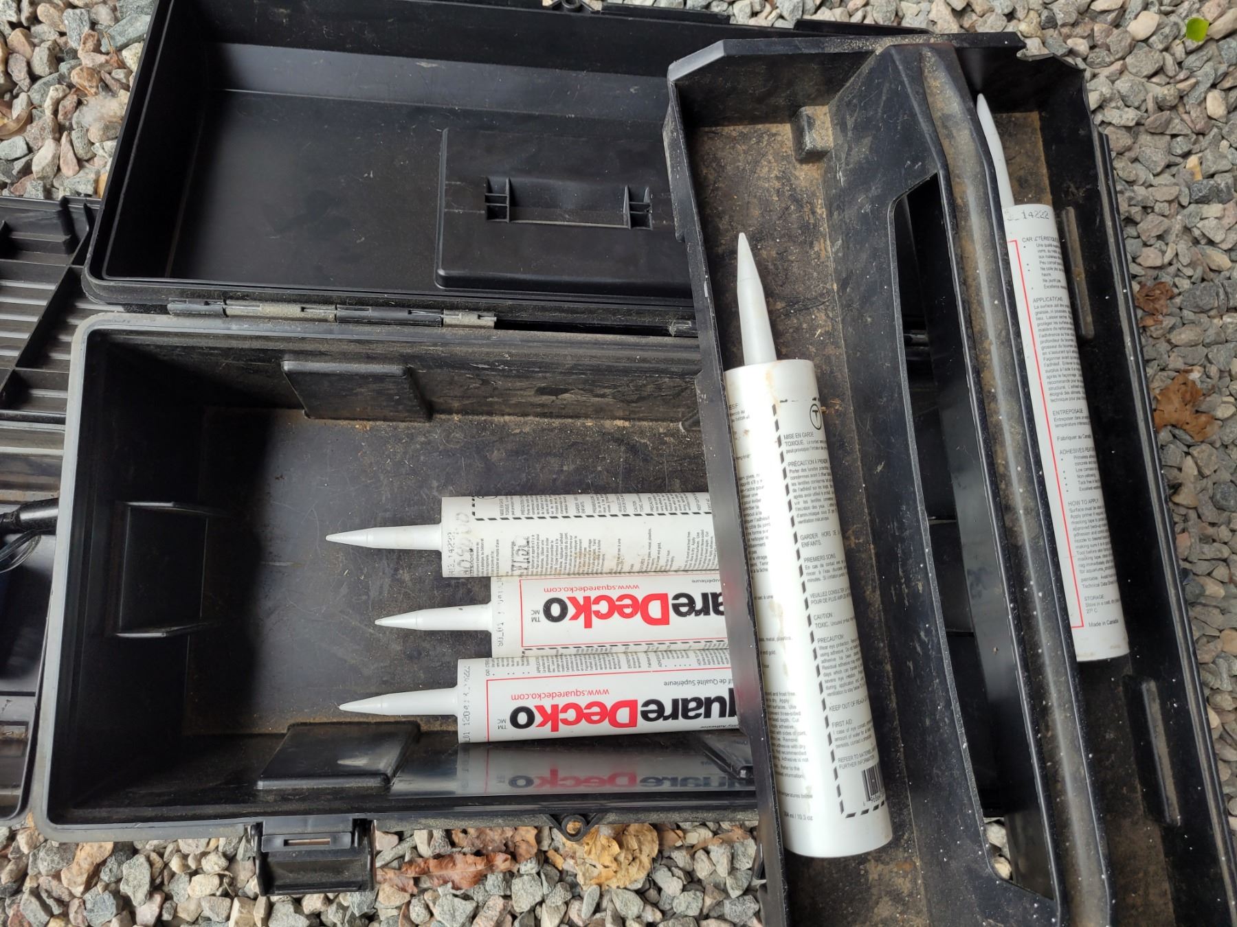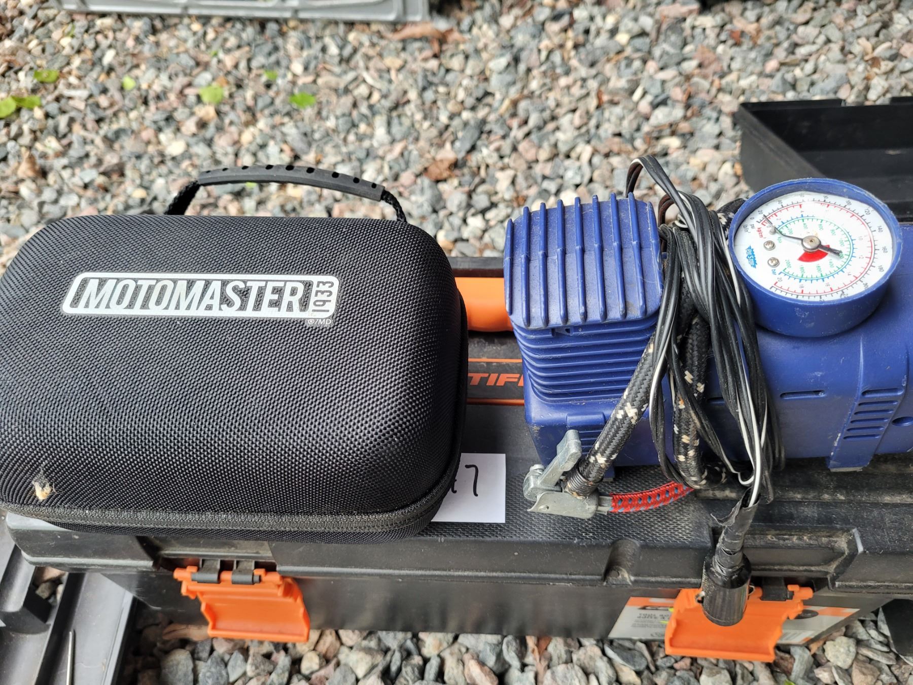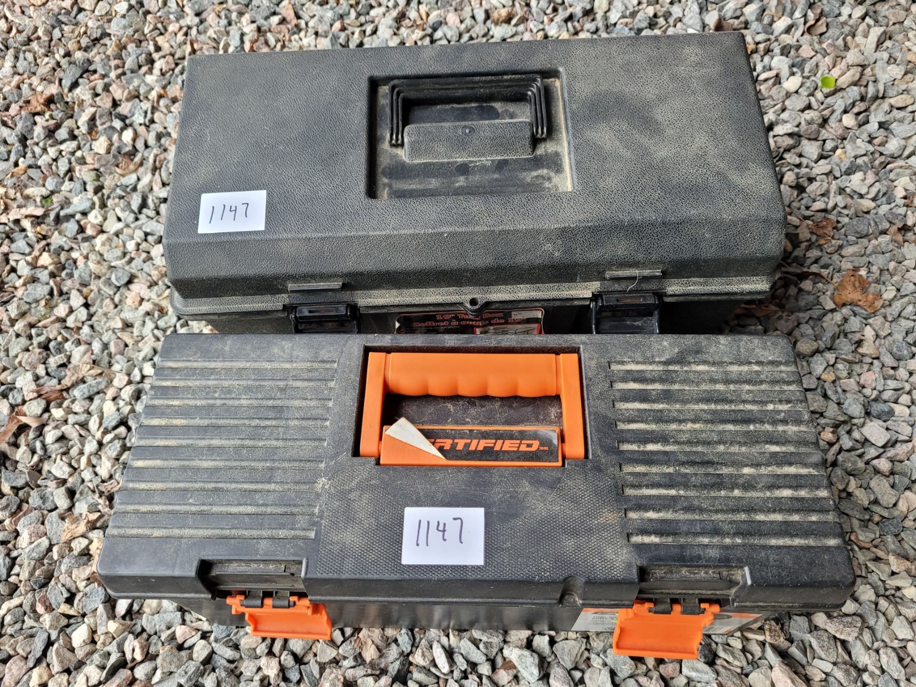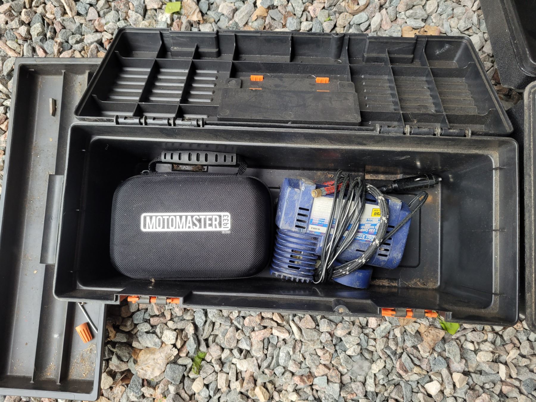 2 tool boxes in great condition - includes deck adhesive caulking, small vehicle air compressor and unused battery booster