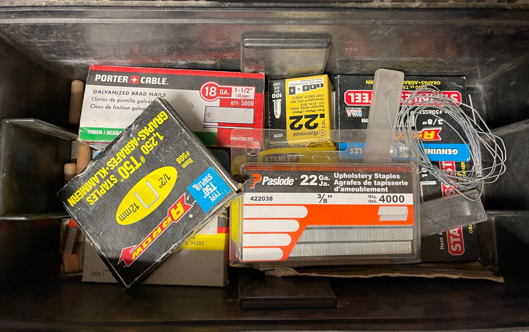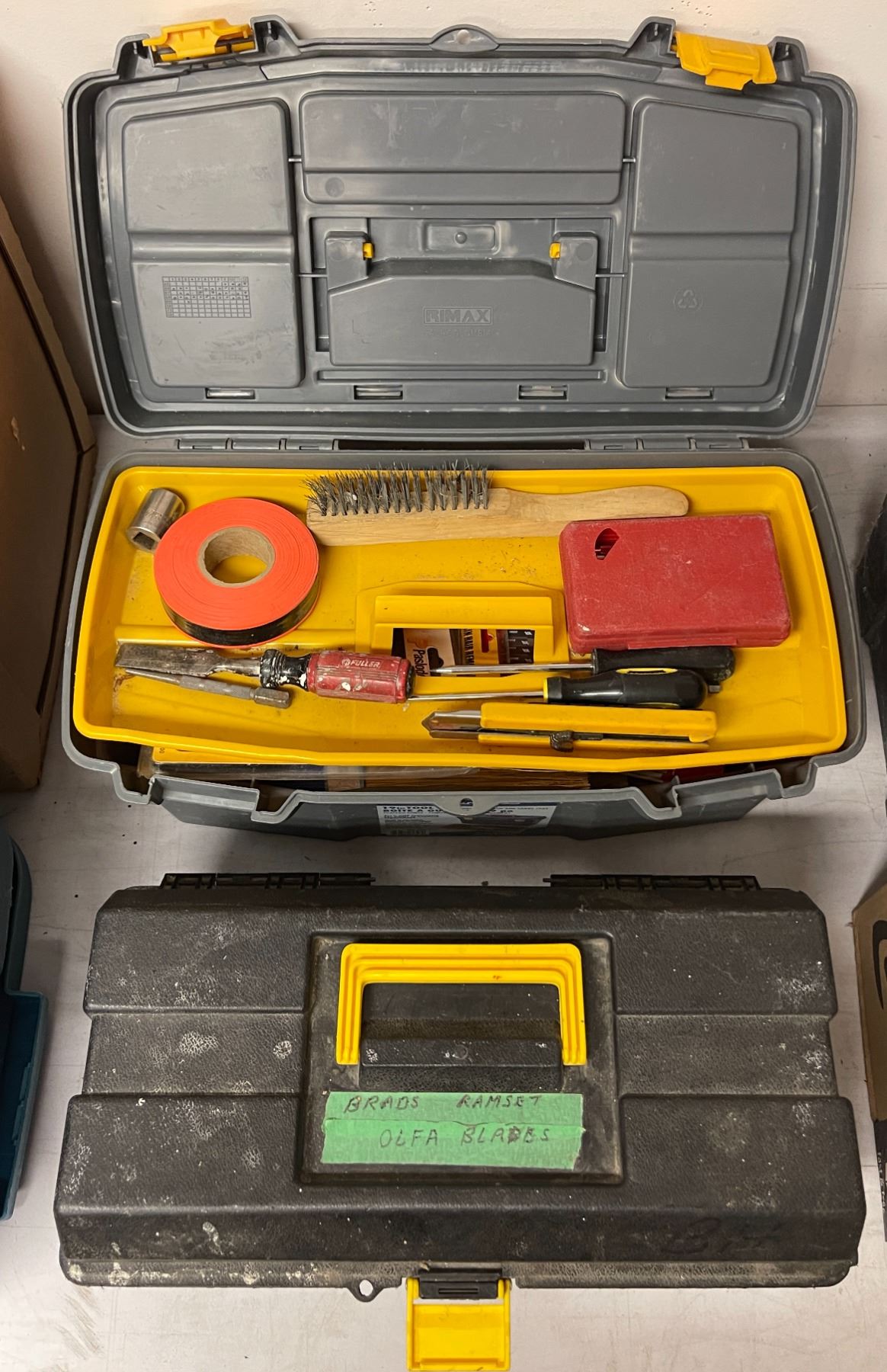 2 toolboxes full of assorted tools & misc - includes screwdrivers / stainless steel staples / Brad nails etc