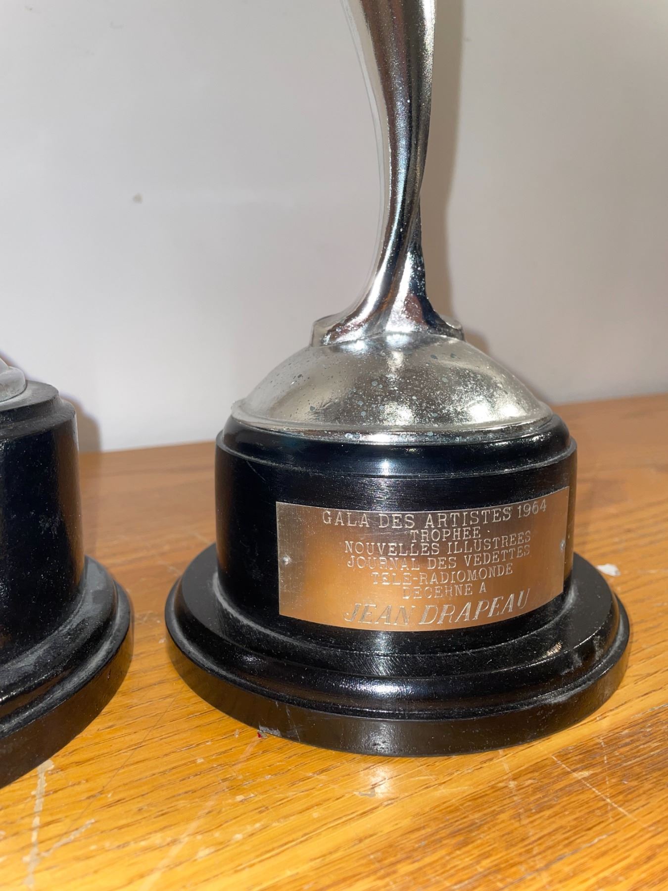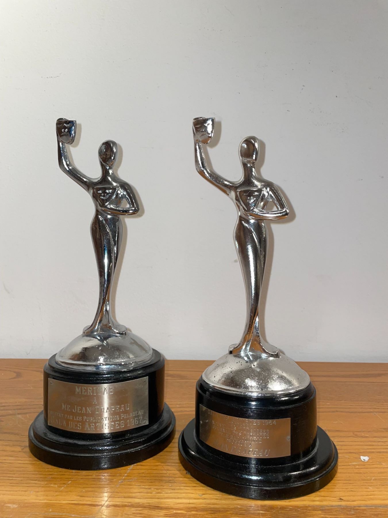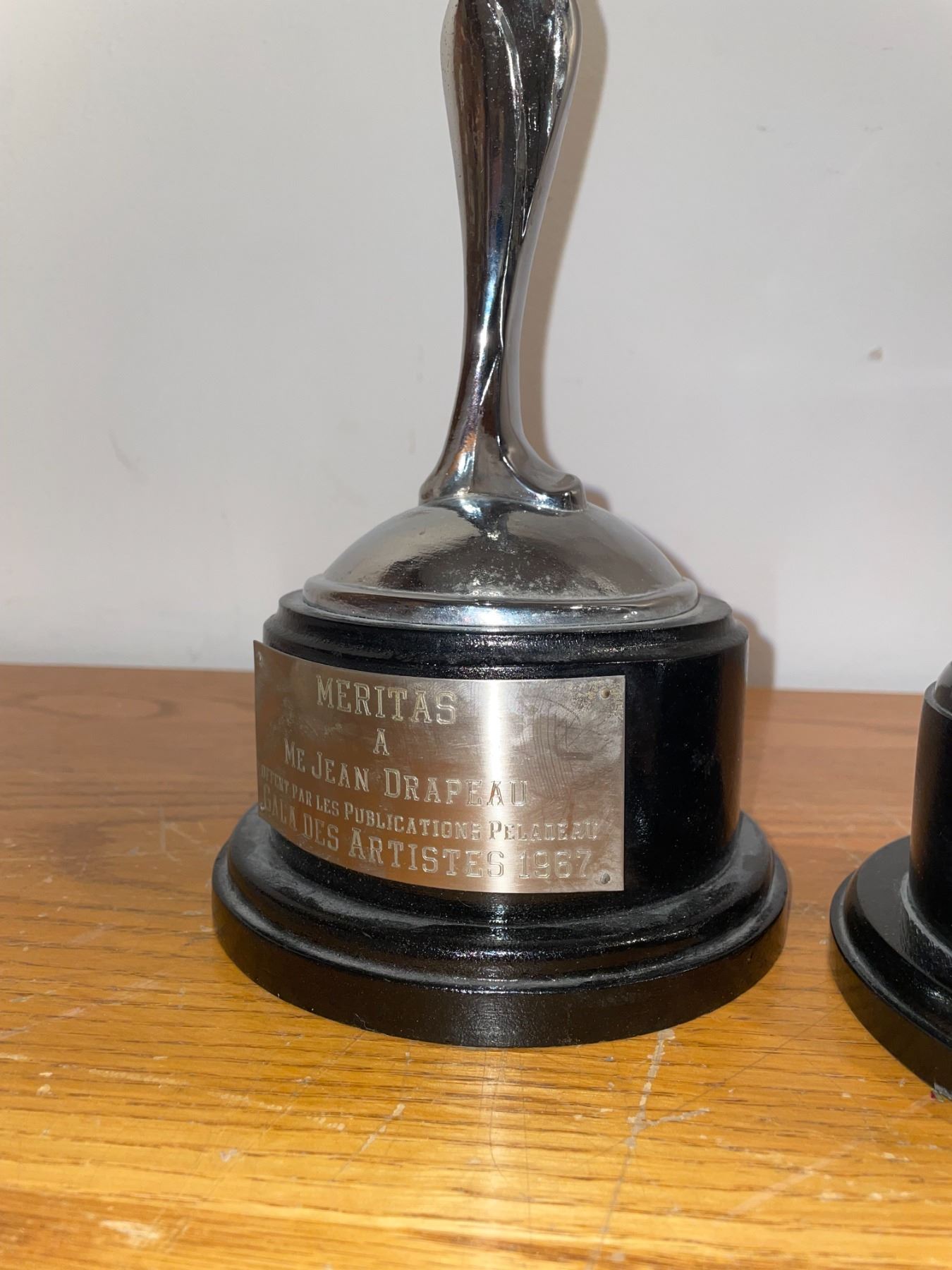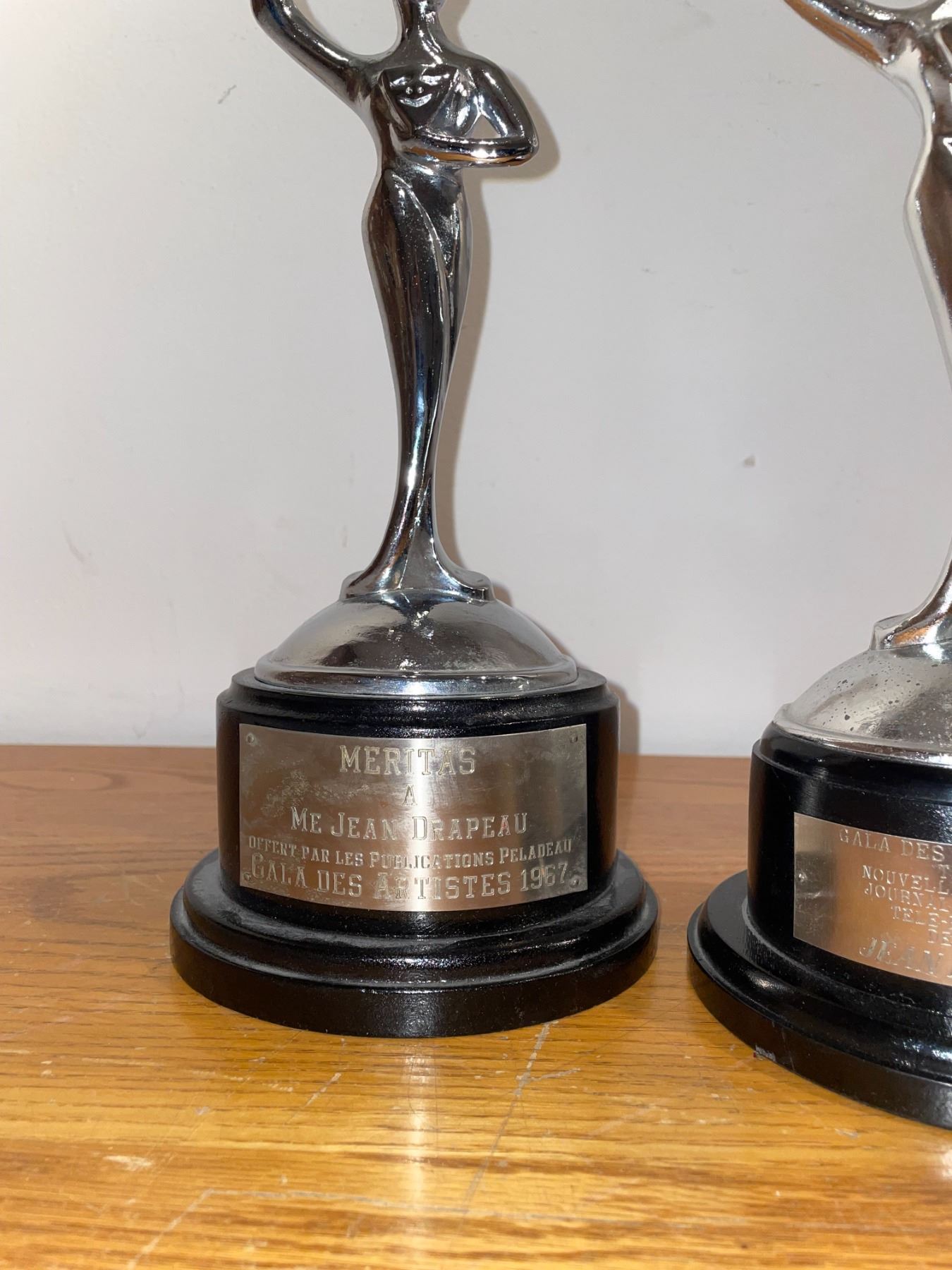 Artists' Gala trophies made of metal on a wooden base, one awarded in 1964 by Nouvelles Illustres..., the other in 1967 by Les Publications Peladeau, Provenance Jean Drapeau Estate \ Librairie Bonheur d'occasion