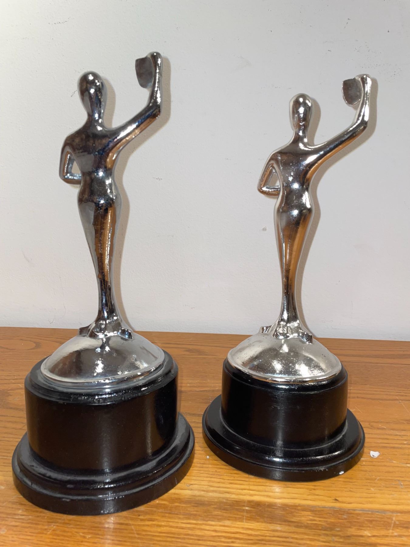 Trophees du Gala des artistes fait de metal sur une base de bois, l'un decerne en 1964 par Nouvelles illustrees..., l'autre en 1967 par Les publications Peladeau, Provenance Succession Jean Drapeau \ Librairie Bonheur d'occasion