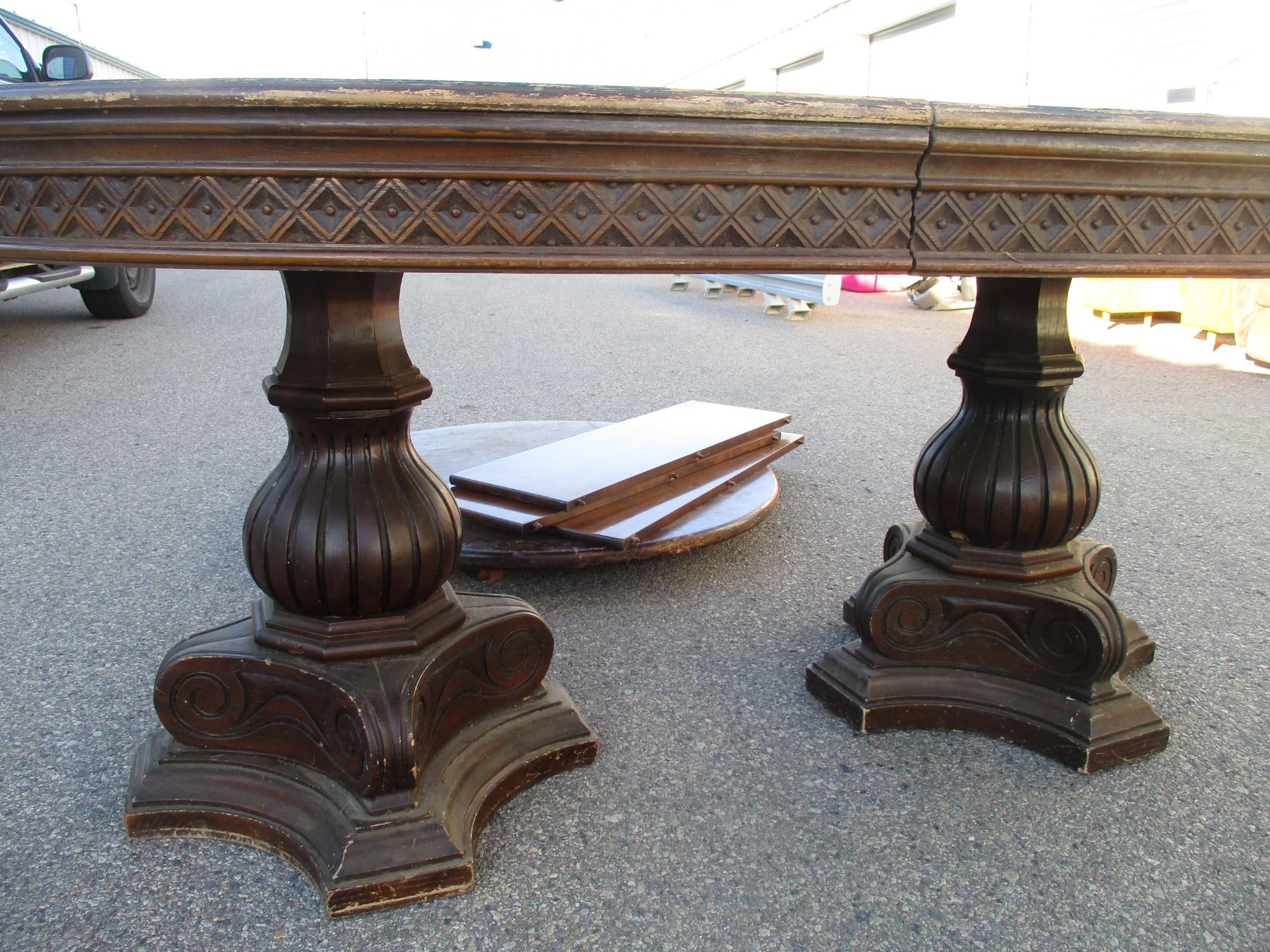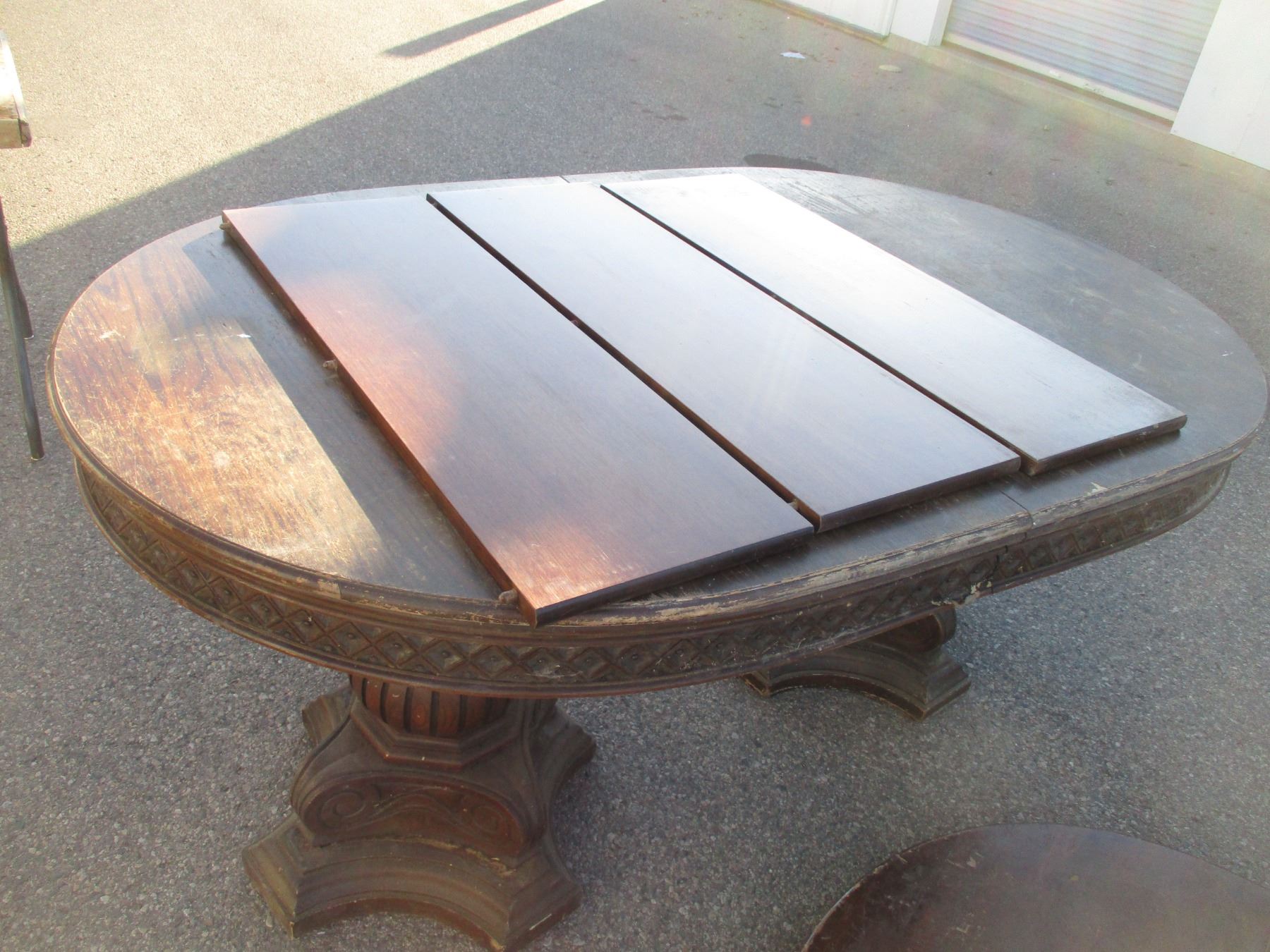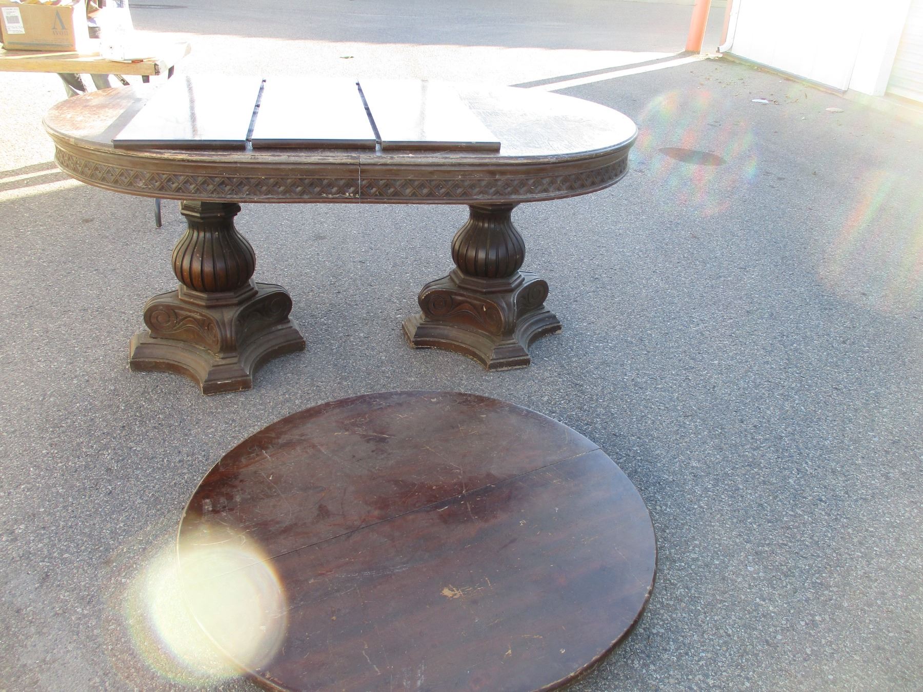2 wooden table tops, table legs, leafs