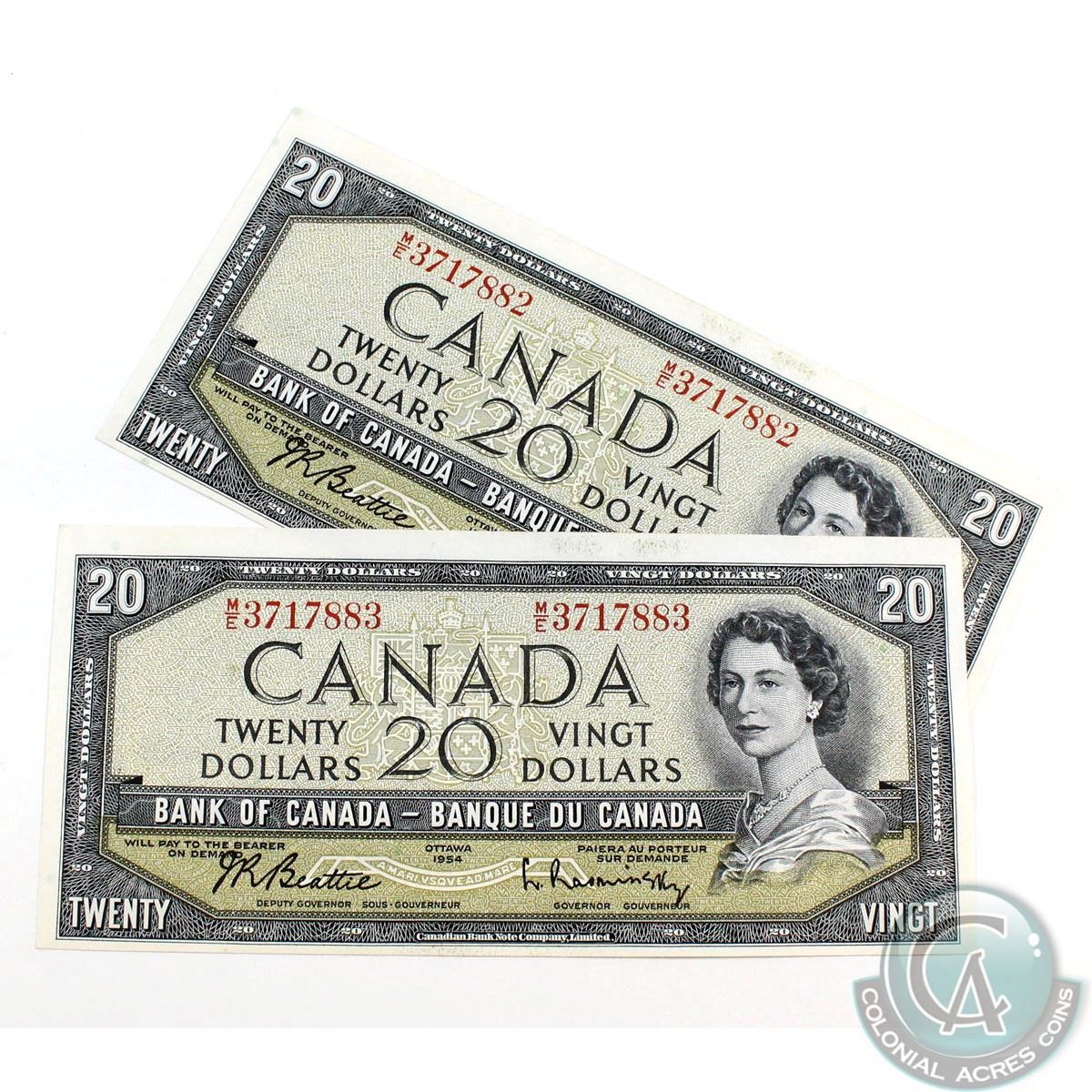 2 x 1954 $20.00 Notes with Beattie-Rasminsky Signatures, M/E Prefix and Consecutive Serial Numbers both in AU. 2pcs.