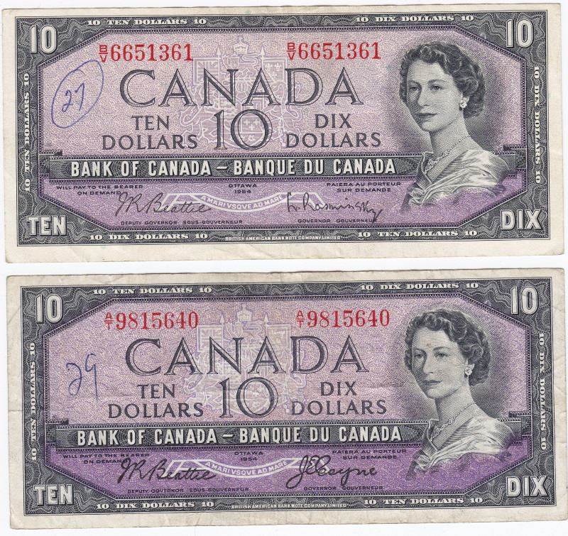 2 x 1954 Bank Of Canada $10 Bank Notes - Both Modified Portraits - 1 x B/V Serial (Beattie/Rasminsky) & 1 x A/T Serial (Beattie/Coyne) - Both With Graffitti - BC-40A