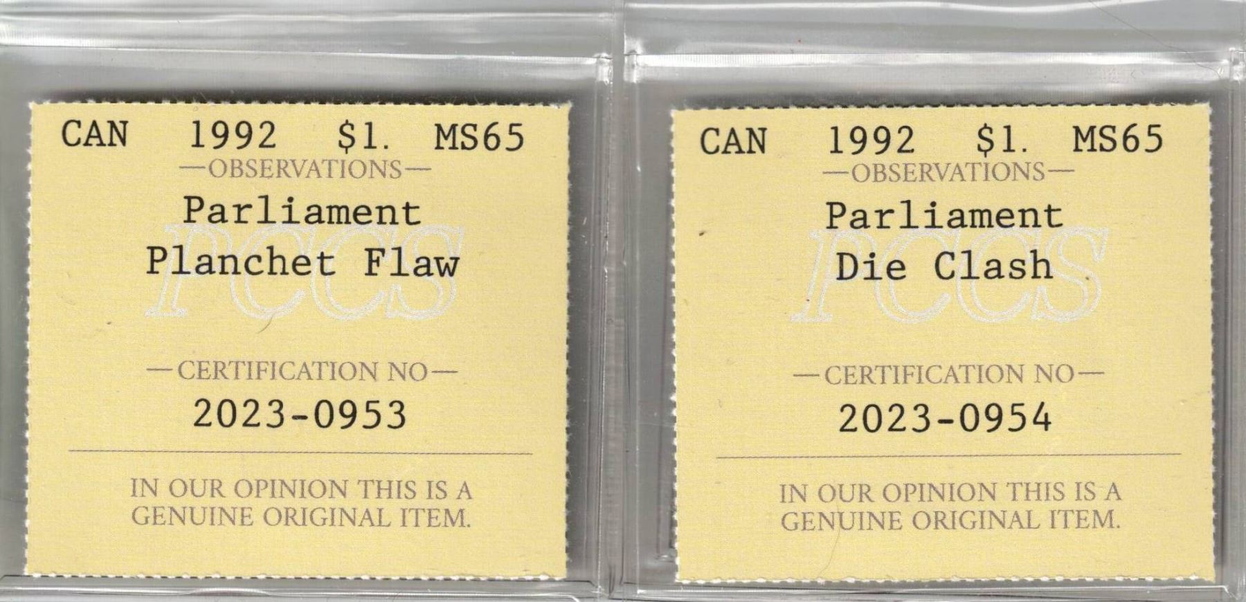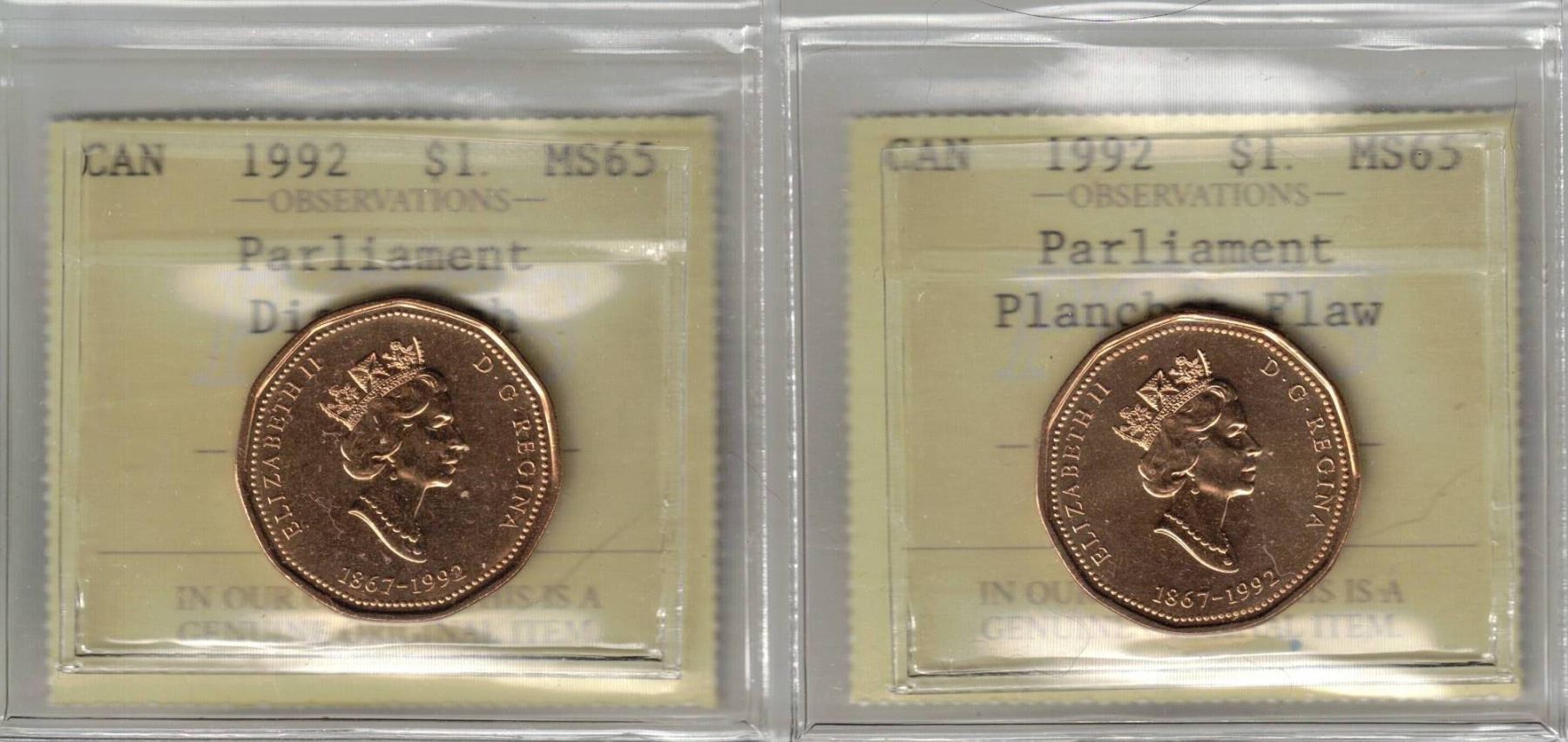 2 x 1992 $1 Parliament MS-65 Die Clash & Planchet Fla,w PCCS (Professional Coin Certification System)
