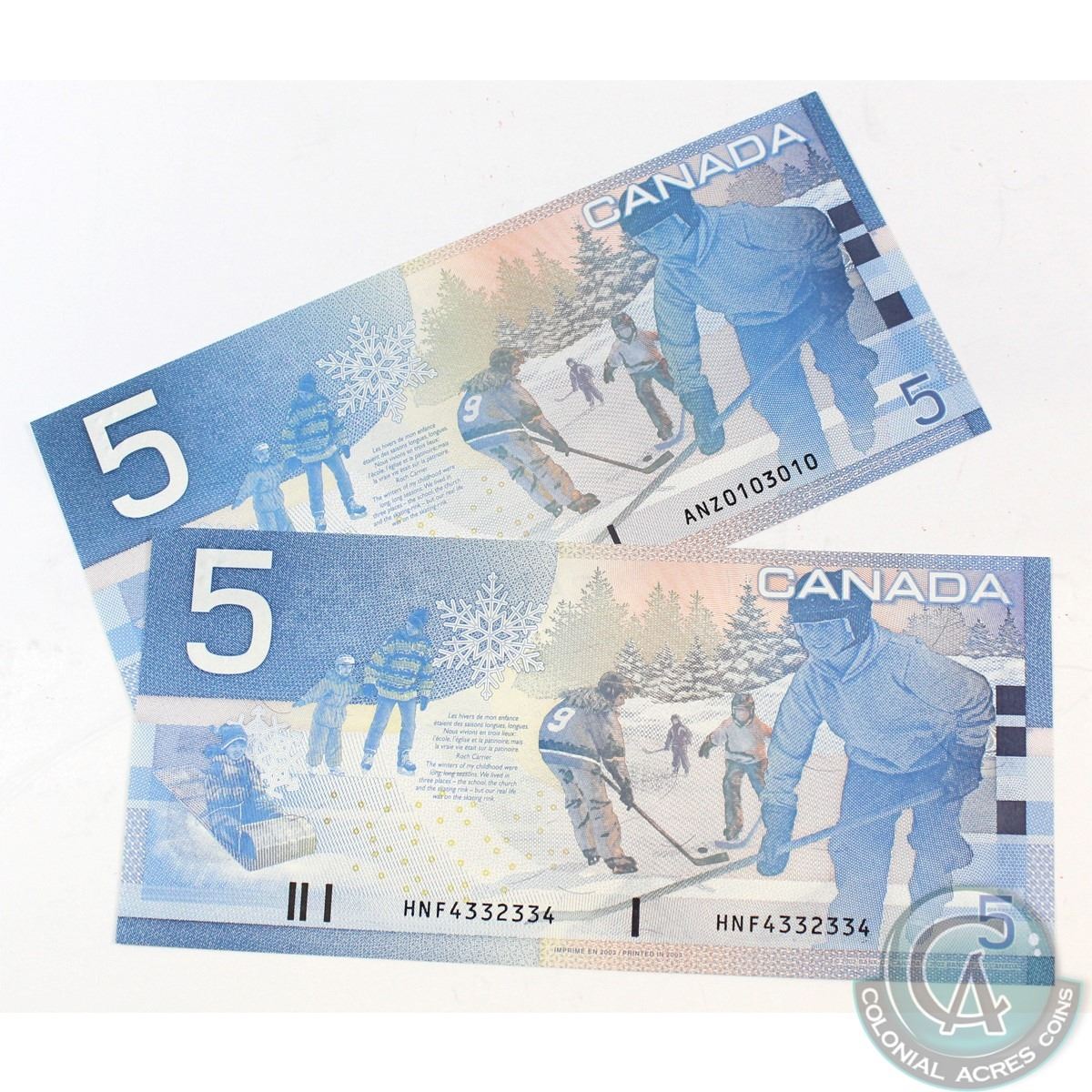 2 x 2002 $5 3 Digit Radar Notes with Serial Numbers HNF4332334 and ANZ0103010. 2pcs.