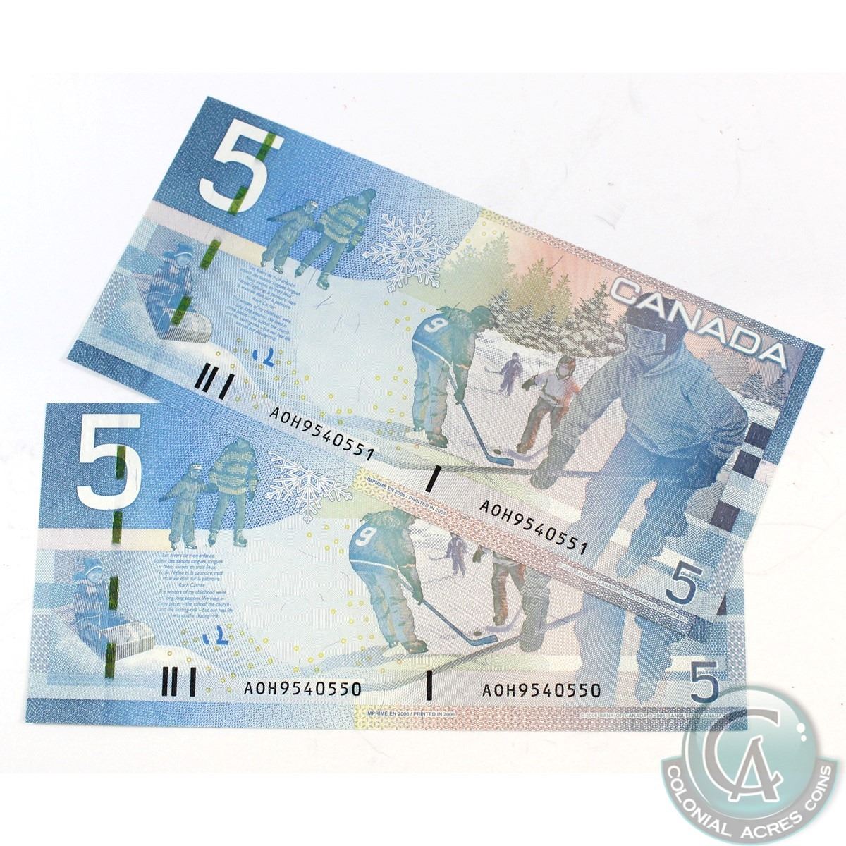 2 x 2006 Replacement $5 notes, Prefix AOH(9.540M-9.544M) with Consecutive Serial Numbers. 2pcs