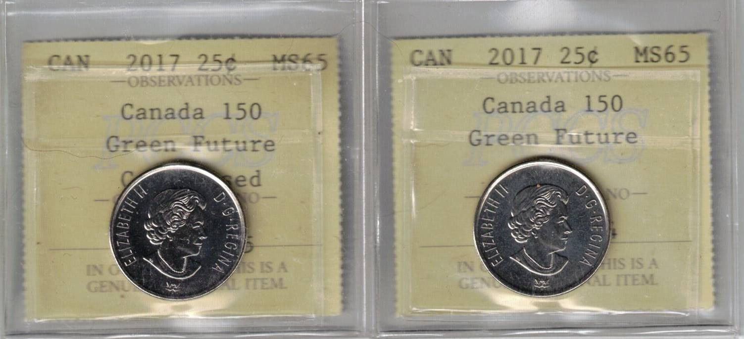 2 x 2017 25¢ Canada 150; Green Future; Colorised & Non Colorised PCCS MS65