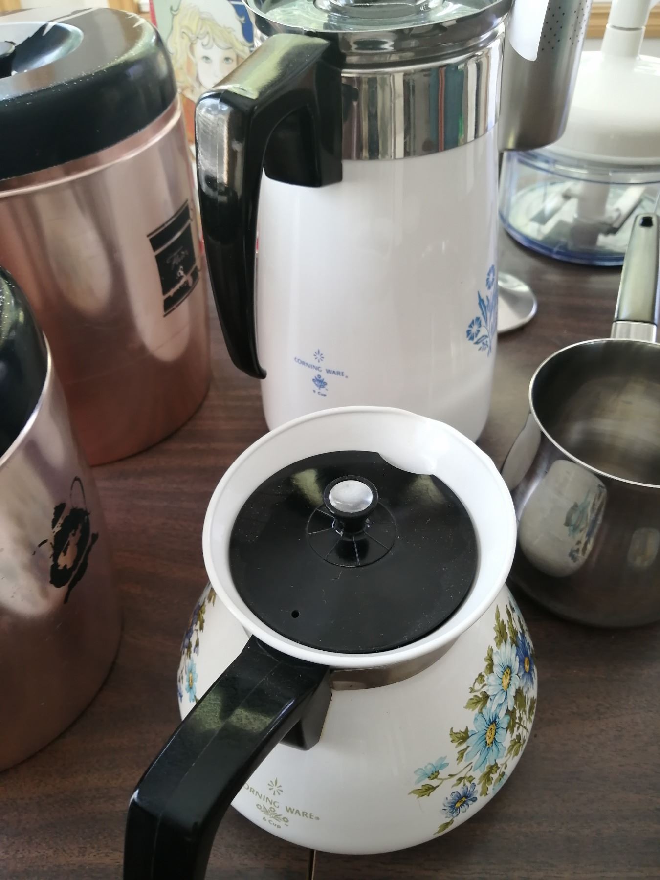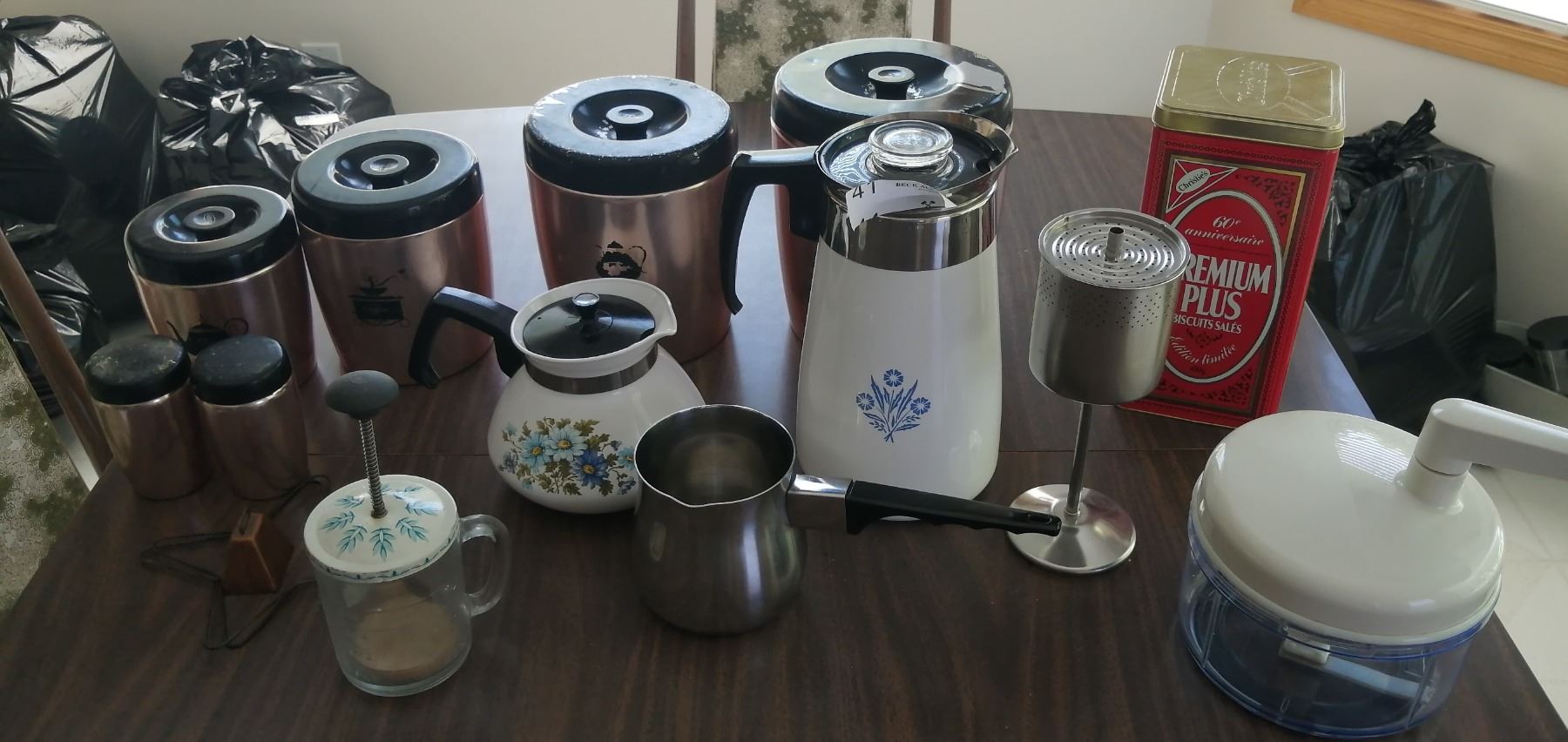 Vintage Nesting Storage Containers (Tea, Coffee, Flour, Sugar, Salt, and Pepper), Garlic Chopper, Corning Ware Tea and Coffee Carafes, and more!