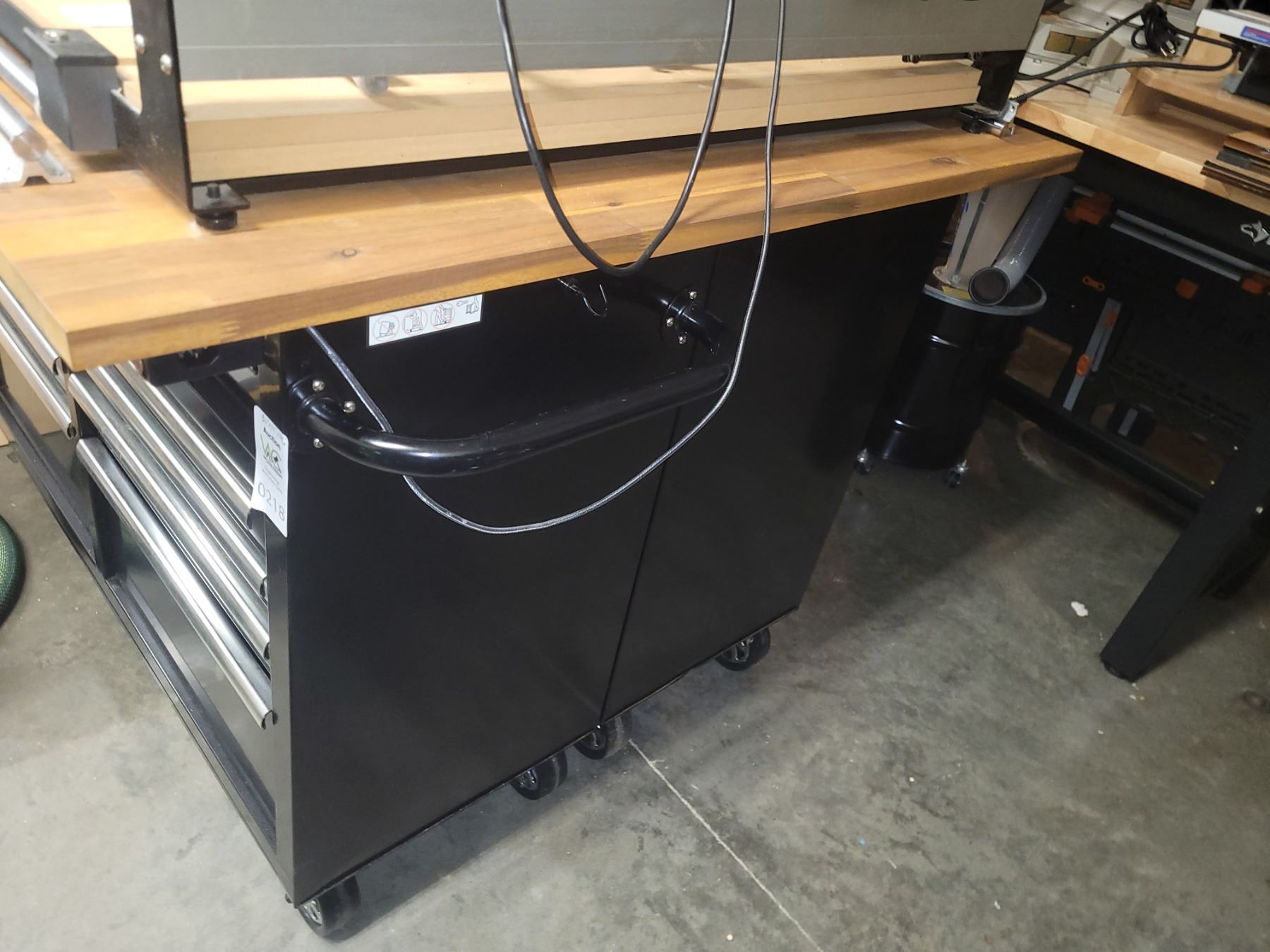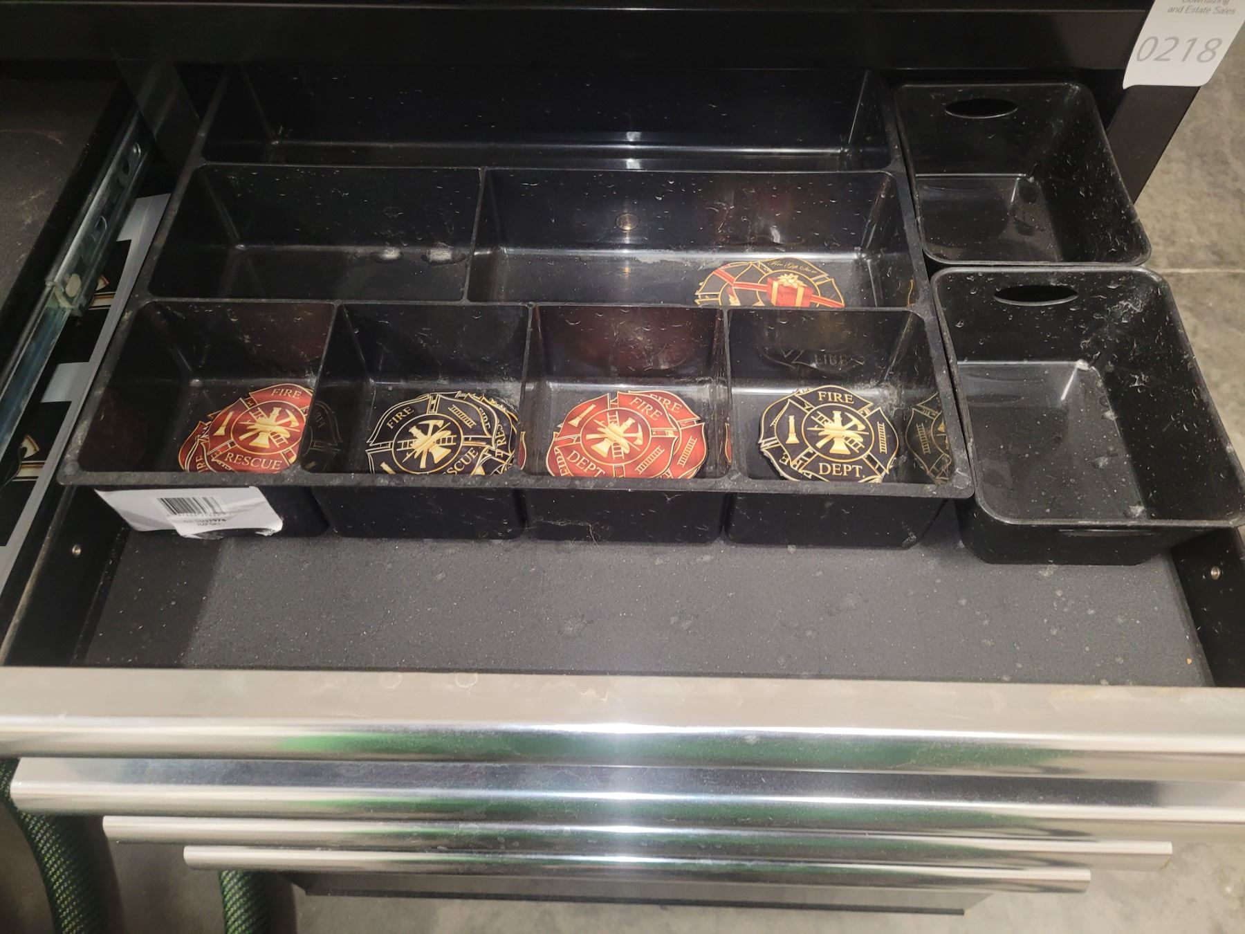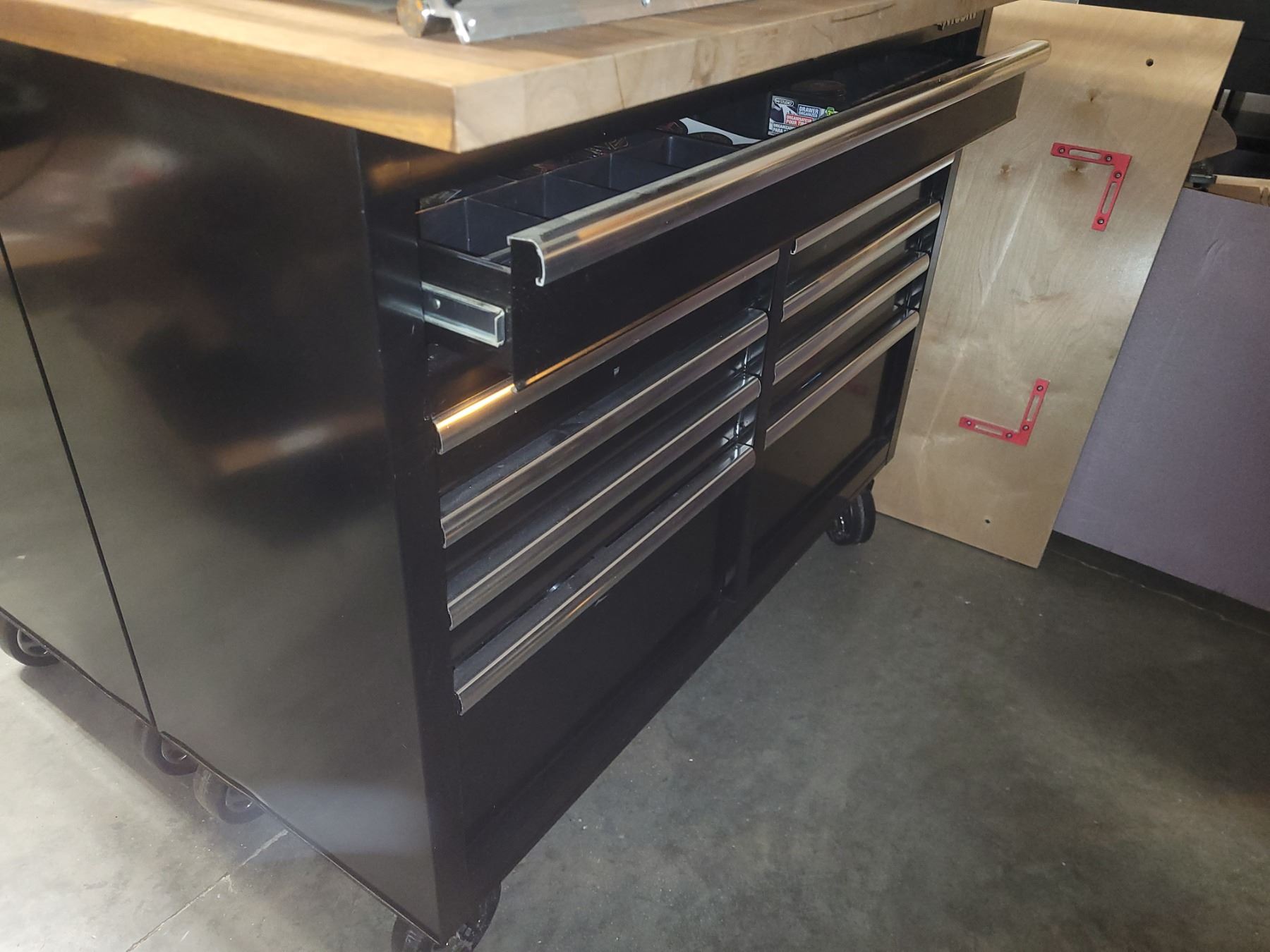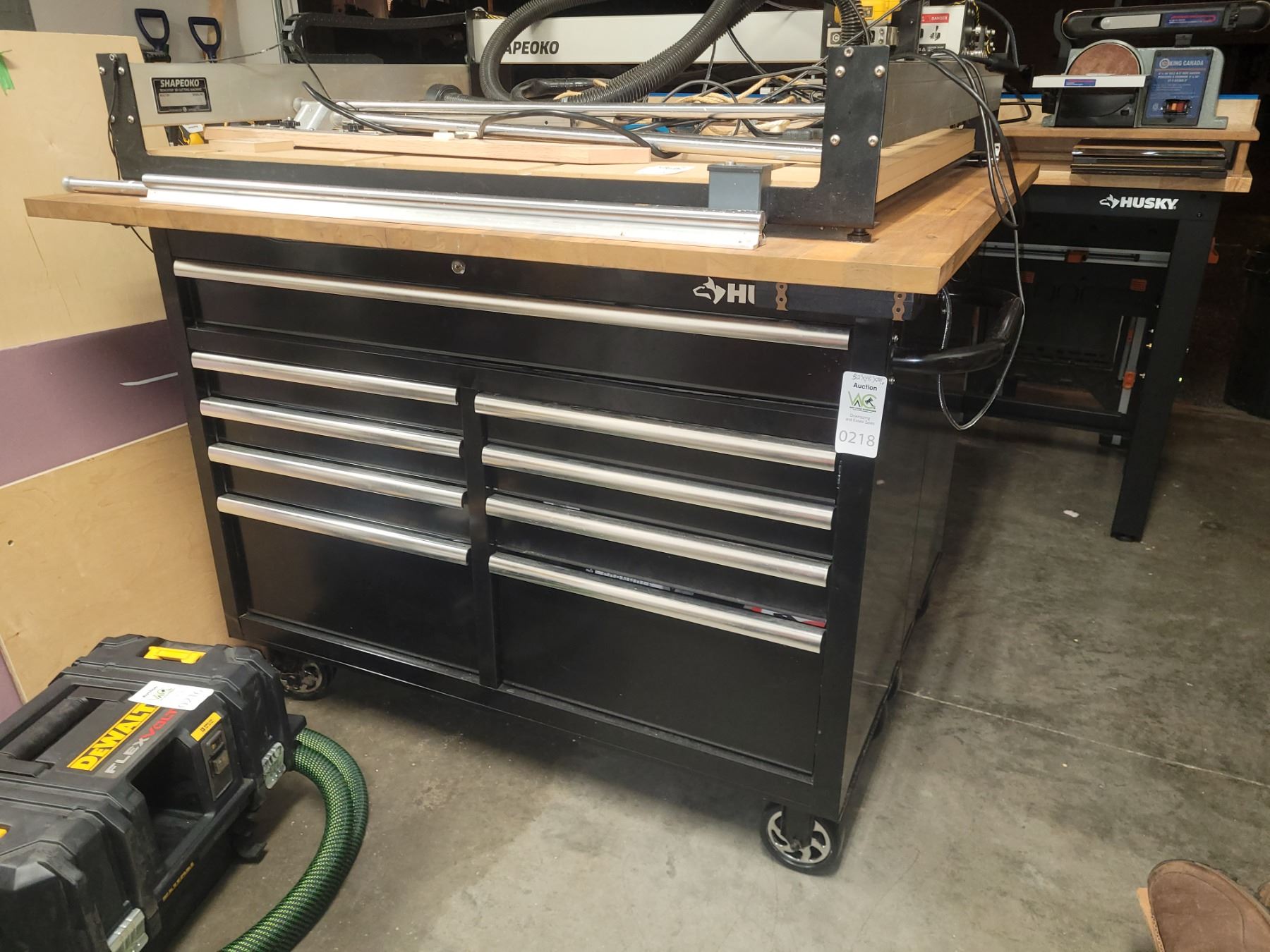 2 chests are joined together to form a work bench. We are unsure if they are bolted together on the sides or just with the top wood bench top. Router on top not included. Rolling chests include contents in drawers 52x48x38 each. Pickup at 11 am