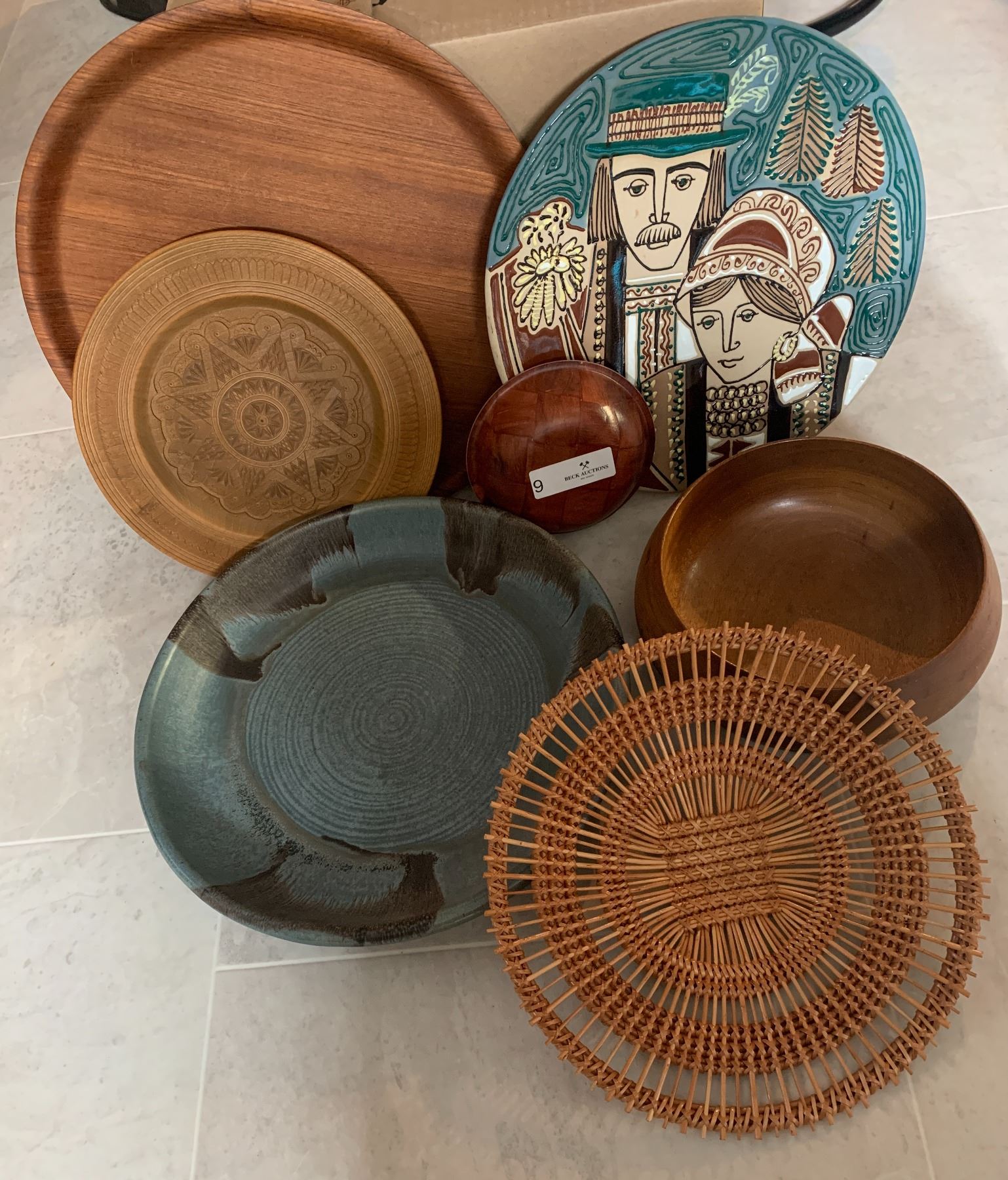 2 x Large Decorative Pottery Plates, 3 x Decorative Wooden Plates, 2 x Wooden Bowls