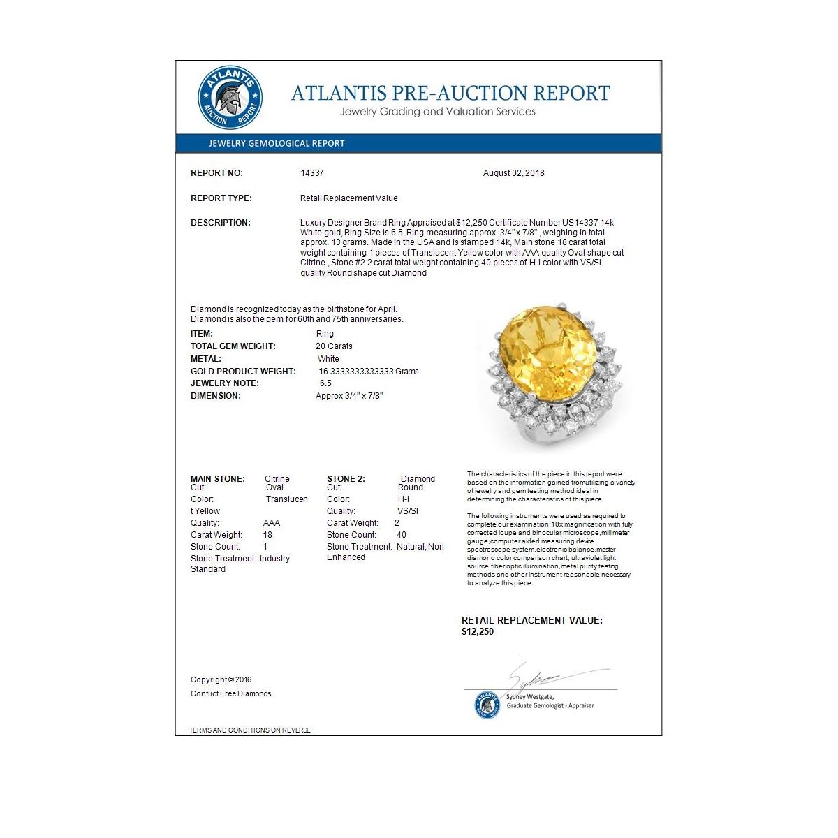 REF-202W2F -14337 ---- 20.0 CTW Citrine & Diamond Ring 14K White Gold ---- Luxury Designer Brand Ring Appraised at $12,250 Certificate Number US14337 14k White gold, Ring Size is 6.5, Ring measuring approx. 3/4" x 7/8" , weighing in total approx. 13 grams. Made in the USA and is stamped 14k, Main stone 18 carat total weight containing 1 pieces of Translucent Yellow color with AAA quality Oval shape cut Citrine , Stone #2 2 carat total weight containing 40 pieces of H-I color with VS/SI quality Round shape cut Diamond