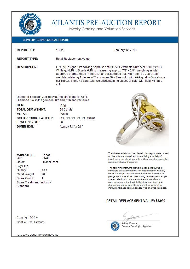 REF-51K3W -10822 ---- 20.0 CTW Lemon Topaz Ring 10K White Gold ---- Luxury Designer Brand Ring Appraised at $3,950 Certificate Number US10822 10k White gold, Ring Size is 6, Ring measuring approx. 7/8" x 5/8" , weighing in total approx. 8 grams. Made in the USA and is stamped 10k, Main stone 20 carat total weight containing 1 pieces of Translucent Sky Blue color with AAA quality Oval shape cut Topaz , Stone #2 carat total weight containing pieces of color with quality shape cut