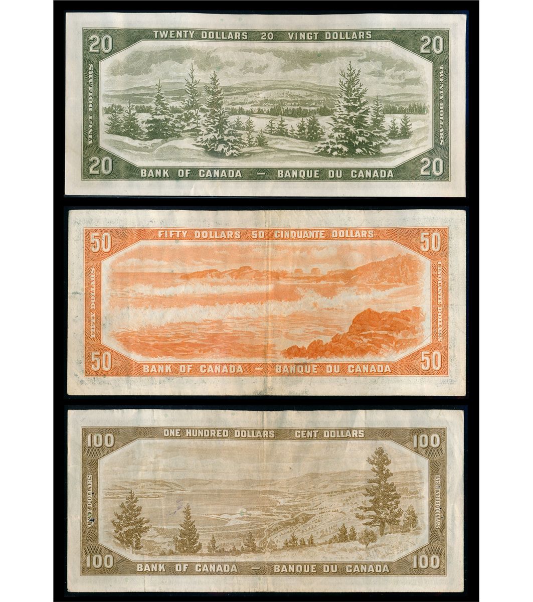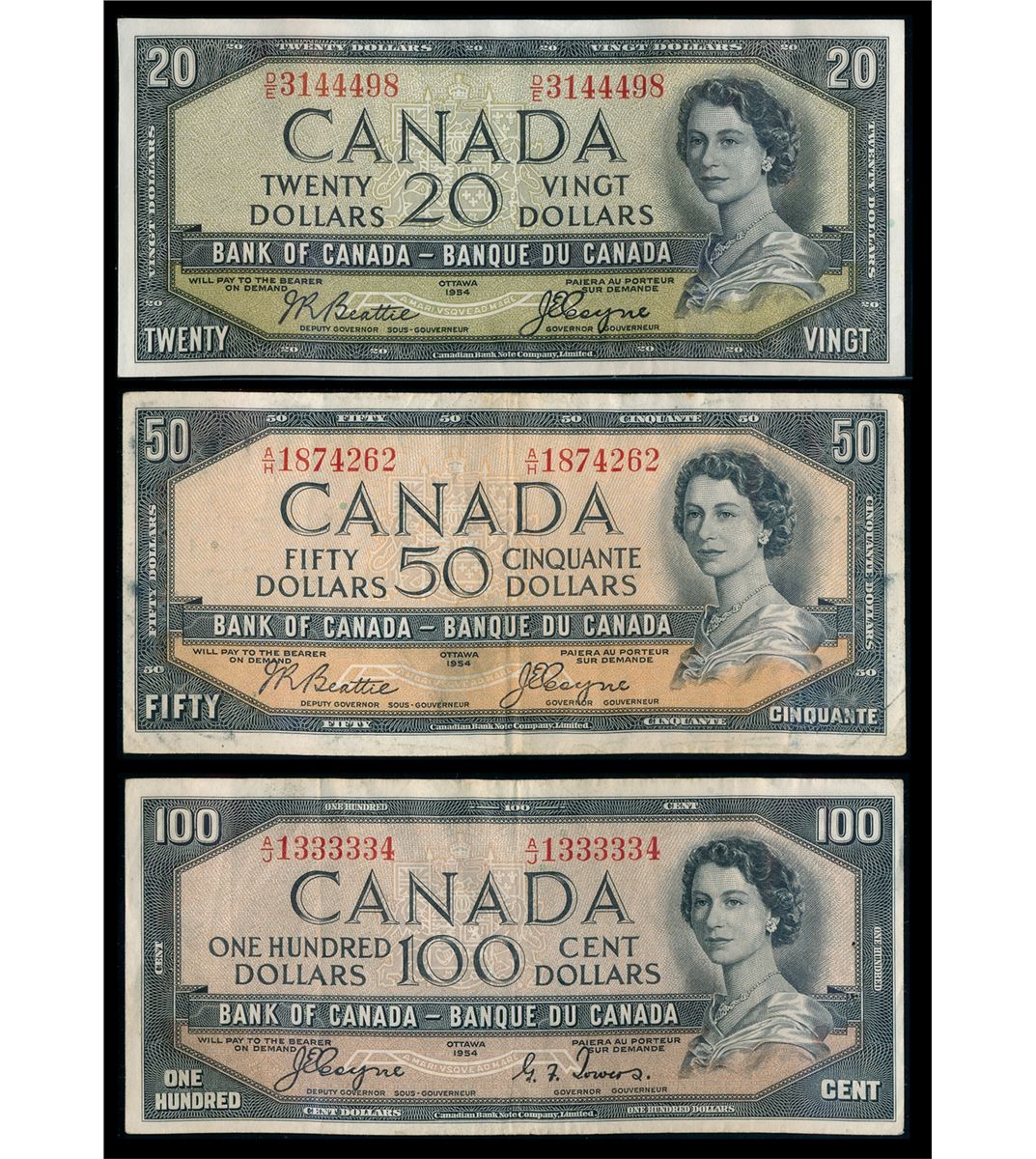 $20.00. 1954 Issue. BC-33b. No. D/E3144498. Beattie-Coyne. 'Devil's Face'. Extra Fine; $50.00. 1954 Issue. BC-34b. No. A/H1874262. Beattie-Coyne. 'Devil's Face'. About Fine; $100.00. 1954 Issue. BC-35a. No. A/J1333334. Coyne-Towers. 'Devil's Face'. Fine+. Lot of three (3) notes.