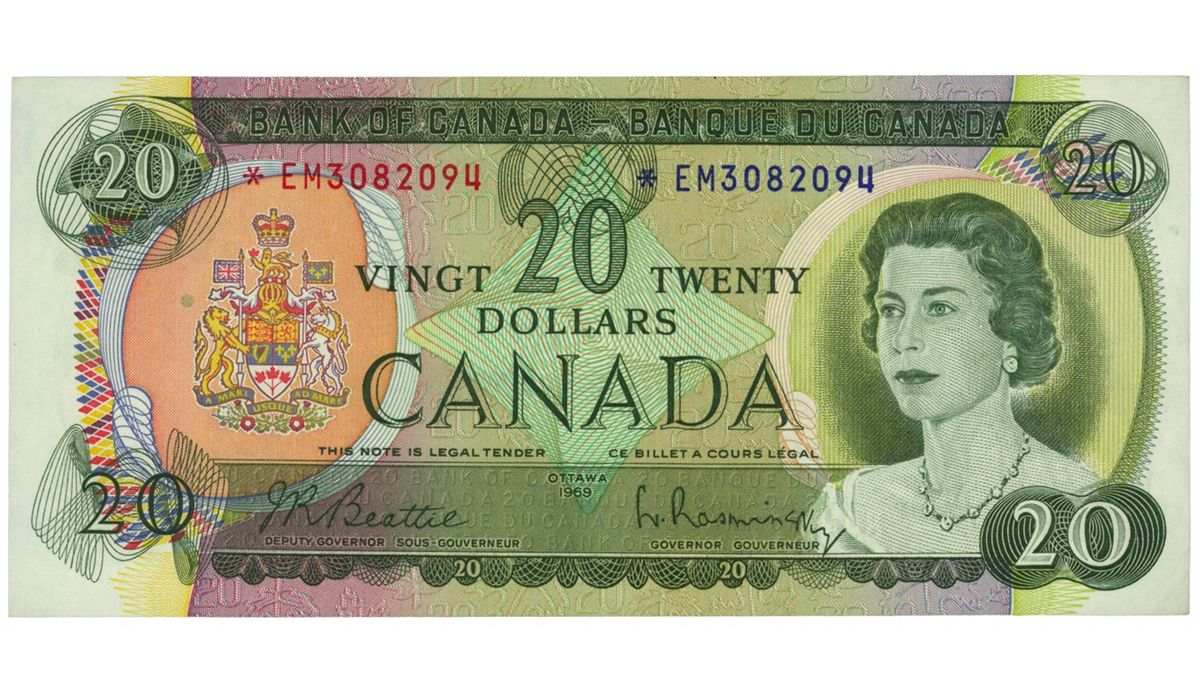 $20.00. 1969. BC-50aA. Beattie-Rasminsky. Replacement Note. No.*EM3082094. PMG graded About Uncirculated-53 EPQ.