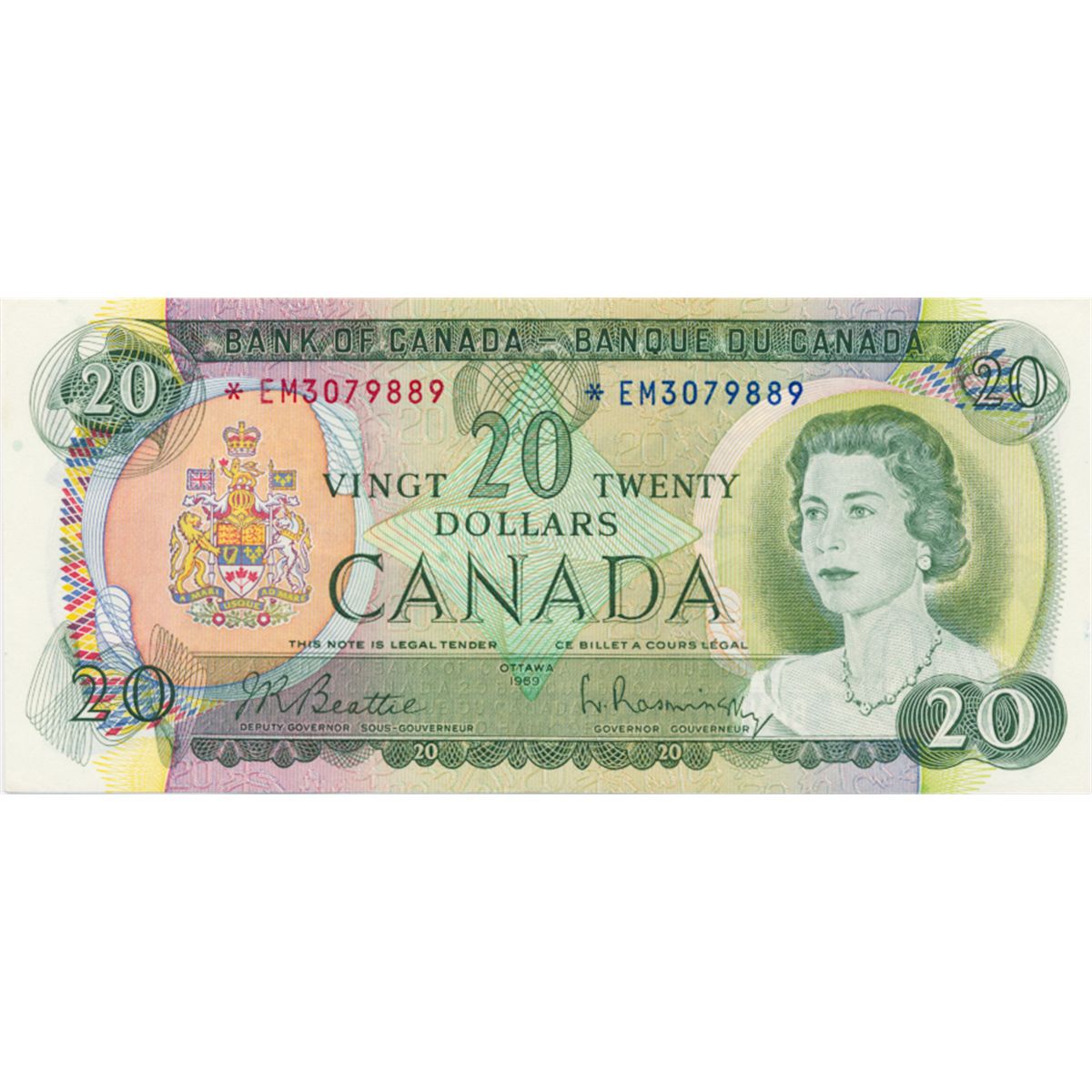 $20.00. 1969 Issue. BC-50aA. Beattie-Rasminsky. No. *EM3079889. CCCS graded AU-50.