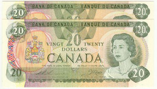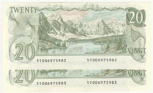 Bank of Canada; $20.00 1979 replacement, BC-54cA, UNC, signature; Thiessen Crow, serial; 51006975982-83. Lot of 2 consecutive replacement notes.
