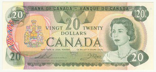 Bank of Canada; $20.00 1979 with printing error, BC-54c, GEM UNC, signature; Thiessen Crow, serial; 52549264678. The only one seen by the cataloguer.