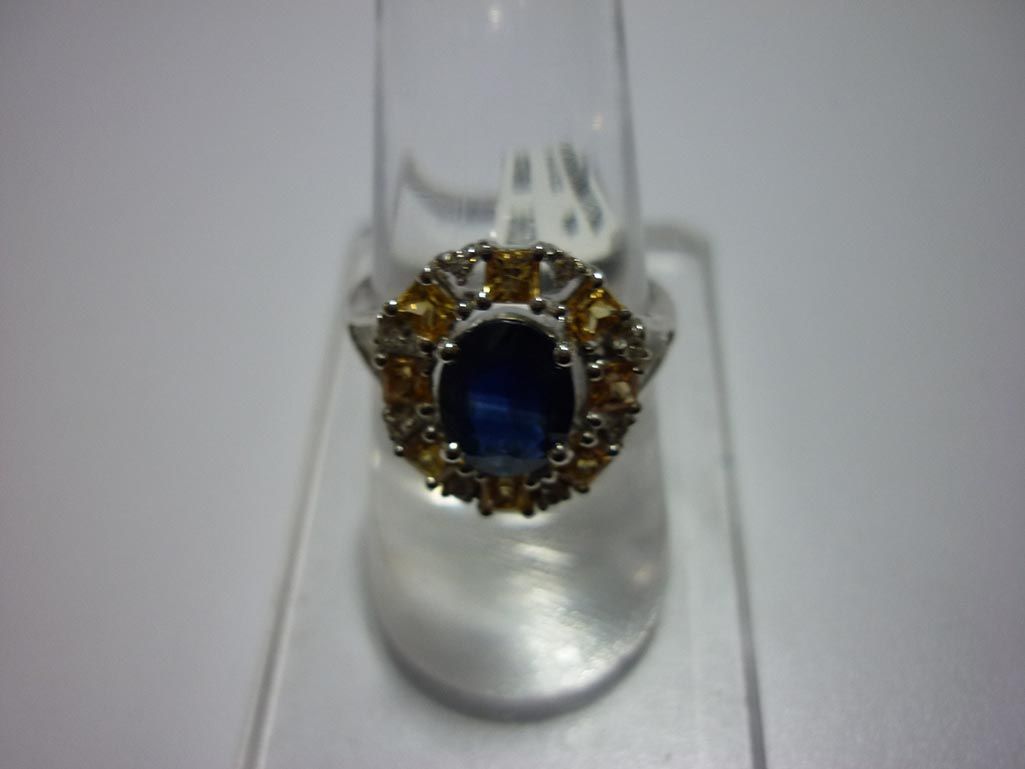 20.00 CTW YELLOW SAPPHIRE/SAPPHIRE/DIAMOND RING .925 ST **|**|** 20.00 CTW YELLOW SAPPHIRE/SAPPHIRE/DIAMOND RING .925 STERLING SILVER ; STONE WEIGHT 3.61 CTW ; DIAMOND WEIGHT 0.11 CTW ; MSRP: $900