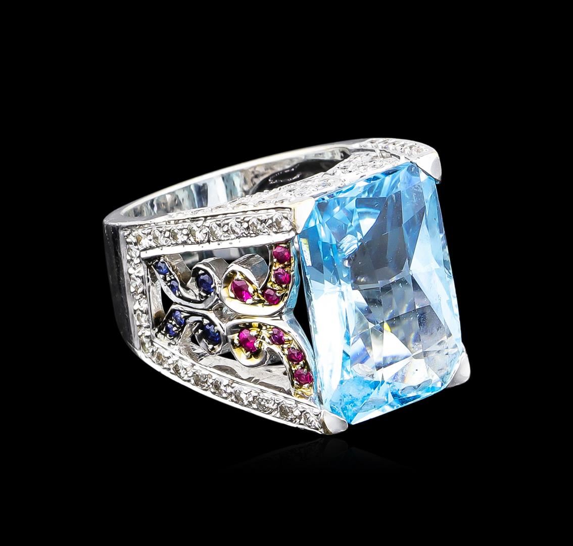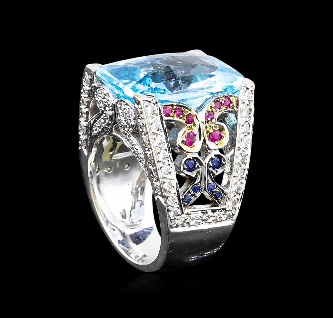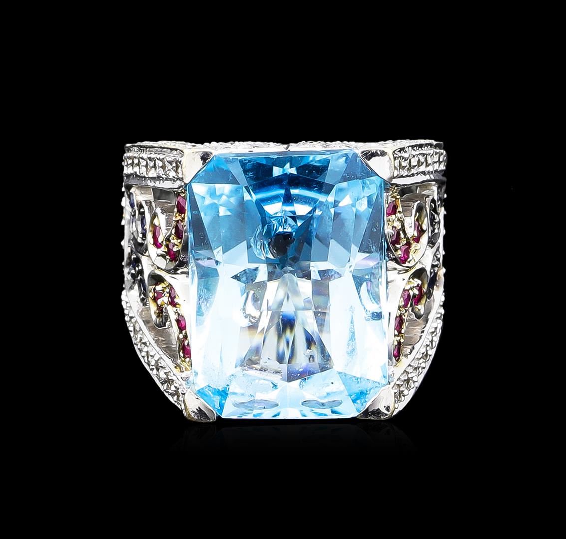 One ring featuring: 14KT white gold weighing 20.51 grams containing one blue topaz with a total weight of 20.00ct, blue sapphires with a total weight of 0.15ct, rubies with a total weight of 0.16, and side diamonds with a total weight of 1.05ct.