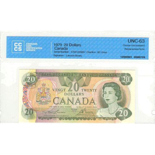 Bank of Canada, $20.00 replacement note 1979, graded CCCS Choice UNC-63, BC-54aA, signature Lawson Bouey, serial 51001203857. Scarce note.
