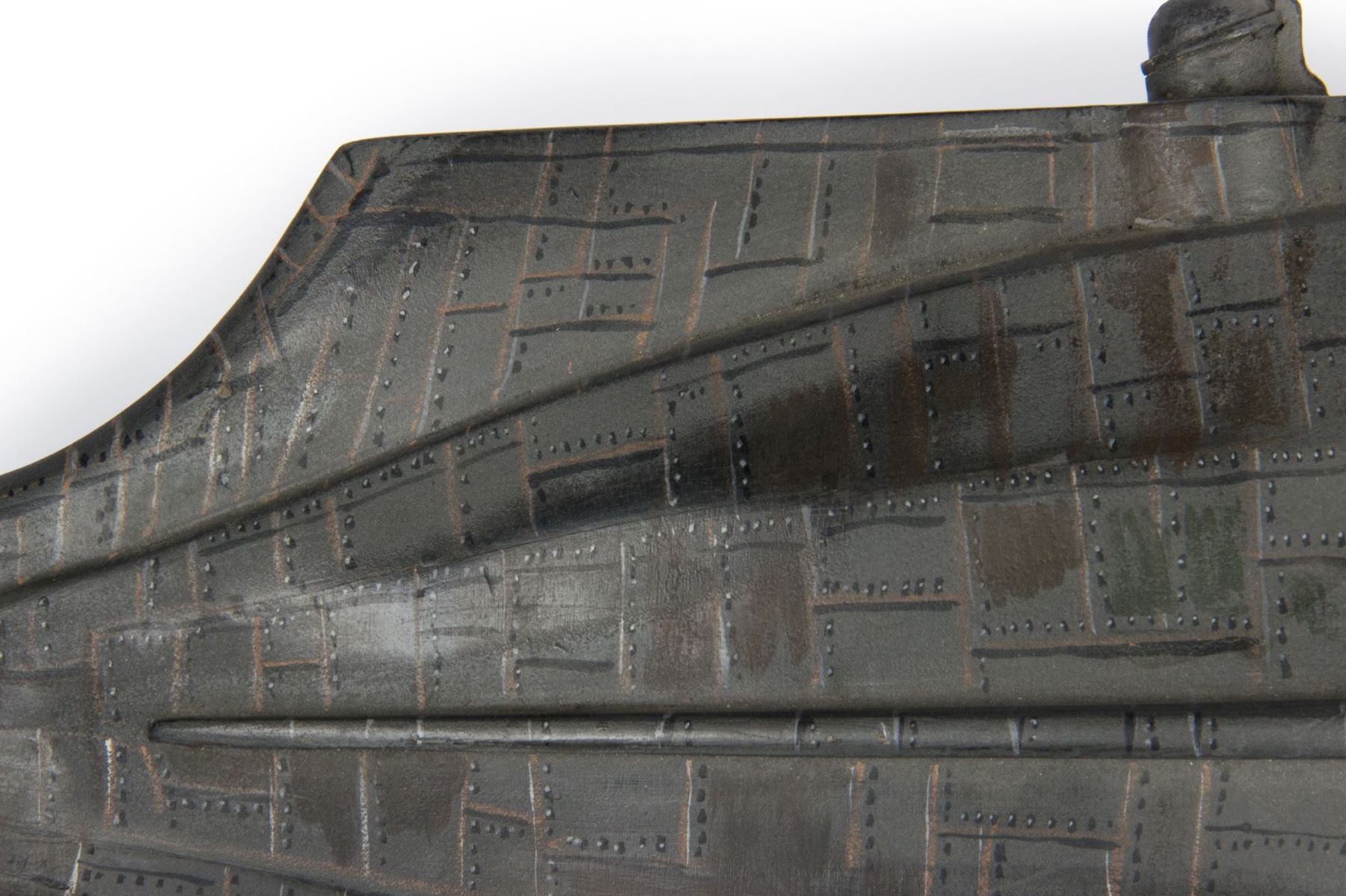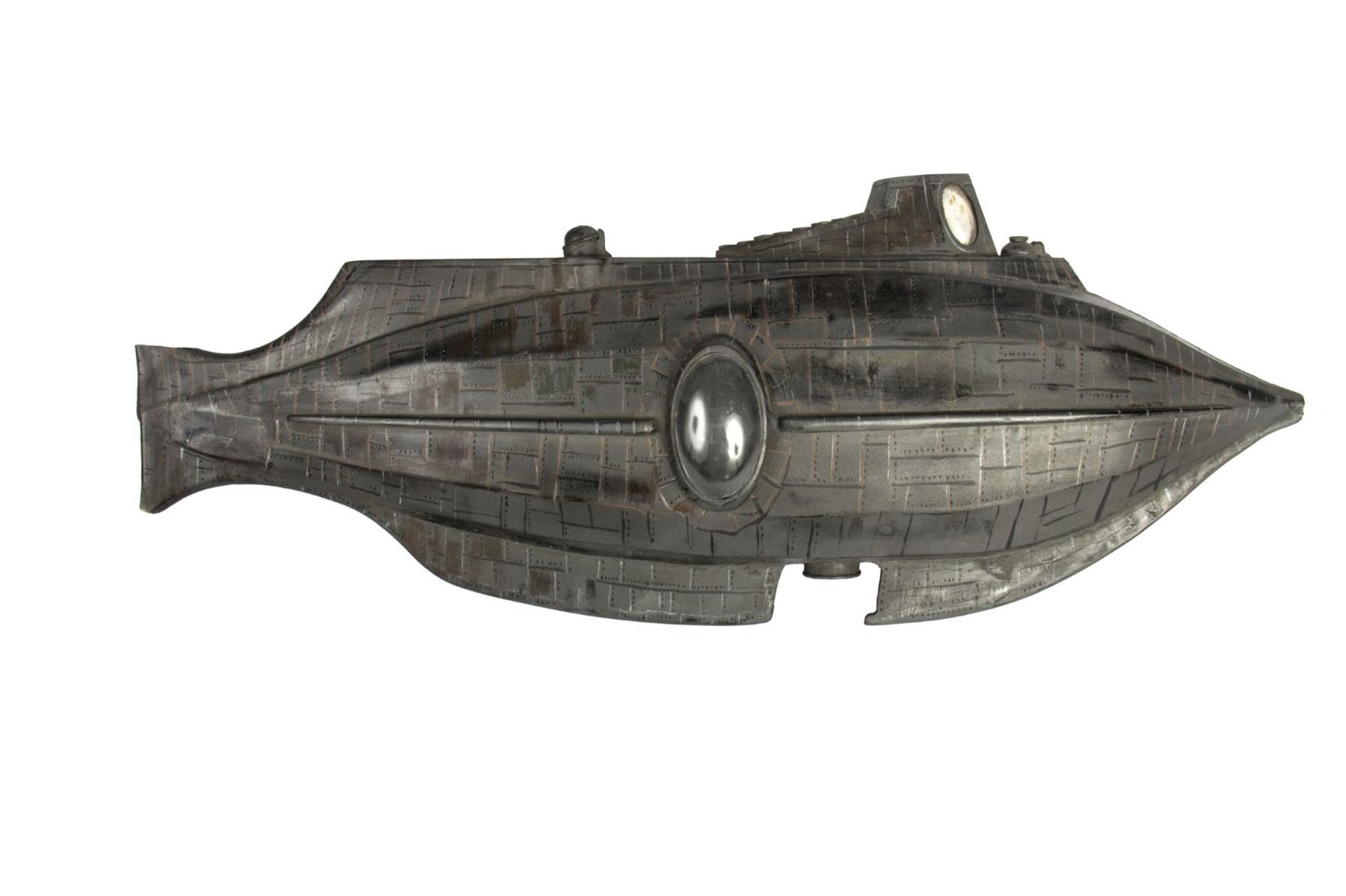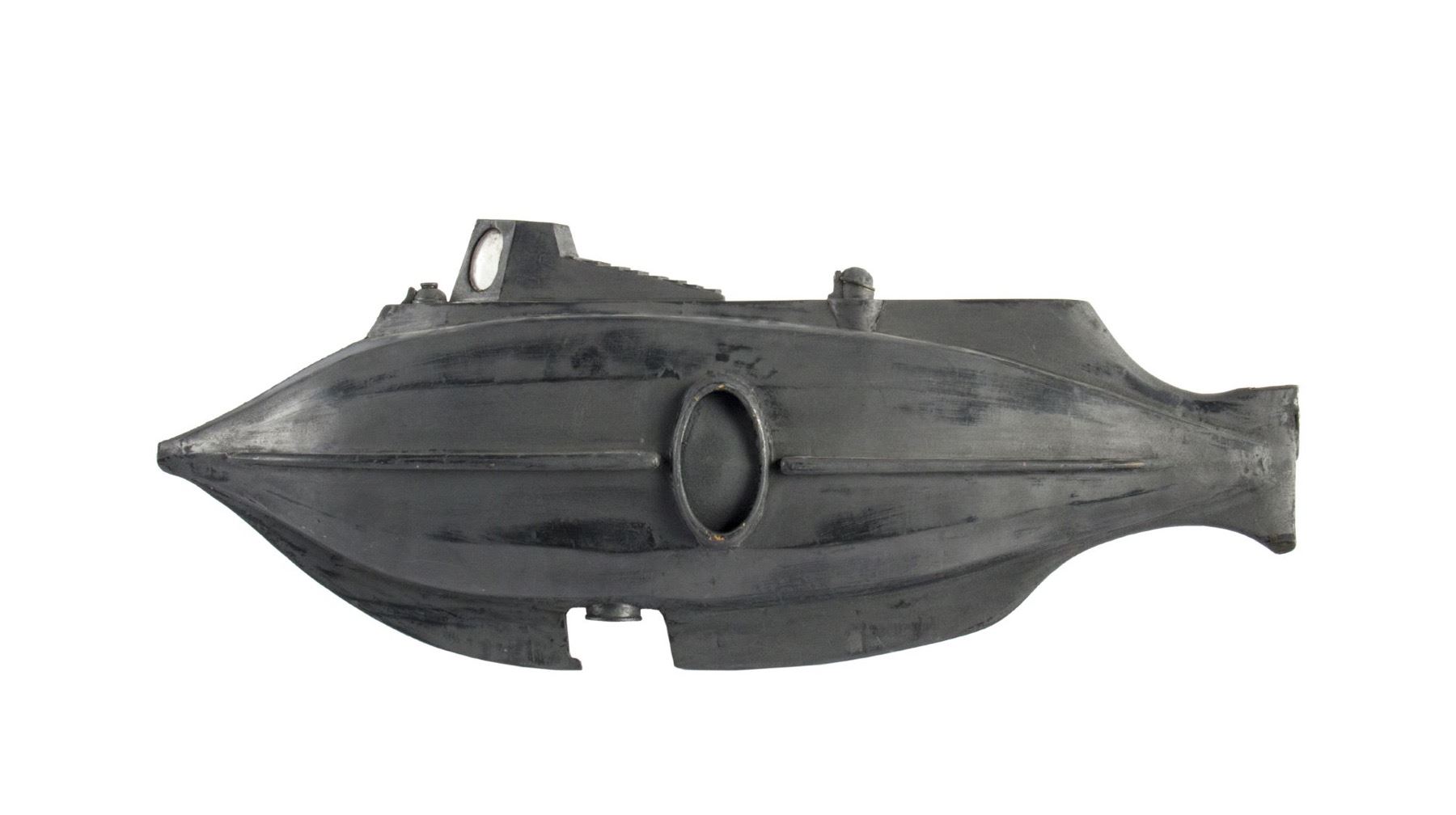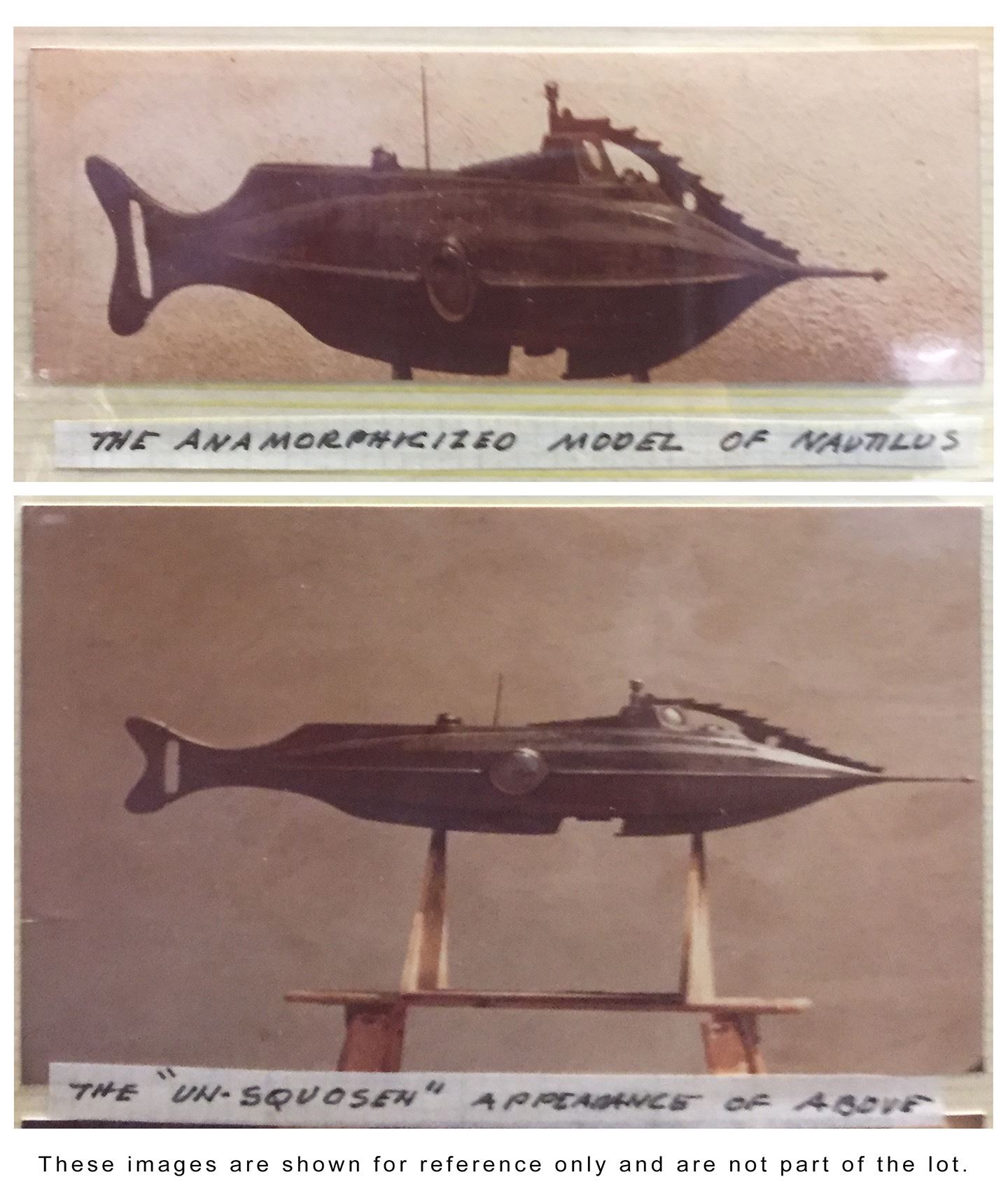 (Disney, c.1953) An extremely rare hand-painted wooden model of the Nautilus from Walt Disney's "20,000 Leagues Under the Sea". This prototype model has been affectionately referred to as the "Anamorphic Nautilus" due to its 'squished' proportions. This model comes from the collection of Harper Goff, who famously designed this rare prototype as a way to solve a unique production issue while filming. At the time, the Studio only had one CinemaScope lens, so Goff devised a way to shoot a 'squished' model using a normal lens that, when projected in CinemaScope, would be 'stretched' to normal proportions. This model of the Nautilus was designed by Goff for those early tests, and photos of this model both before and after the 'stretch' were kept by Goff in his personal scrapbook. It is unclear if this technique was ultimately used in any final scenes in the film, as various interviews with production staff from the film recount that this technique was used, however it is difficult to determine this within the footage itself. Nevertheless, Goff's own accounts of designing this prototype describe details such as the rivets being painted in an oval shape so that they would stretch to become circular, as can be seen in the small painted oval rivets in this model. Measuring approximately 22" long and 9" tall, this model is in fair to good condition with some surface scratches and areas of wear from use and age. There are some portions of the model which are now missing, including the ram and rakers, rudder, and flagpole. This incredibly rare artifact is a wonderfully unique version of the Nautilus and plays an important role in the creation of this iconic film.