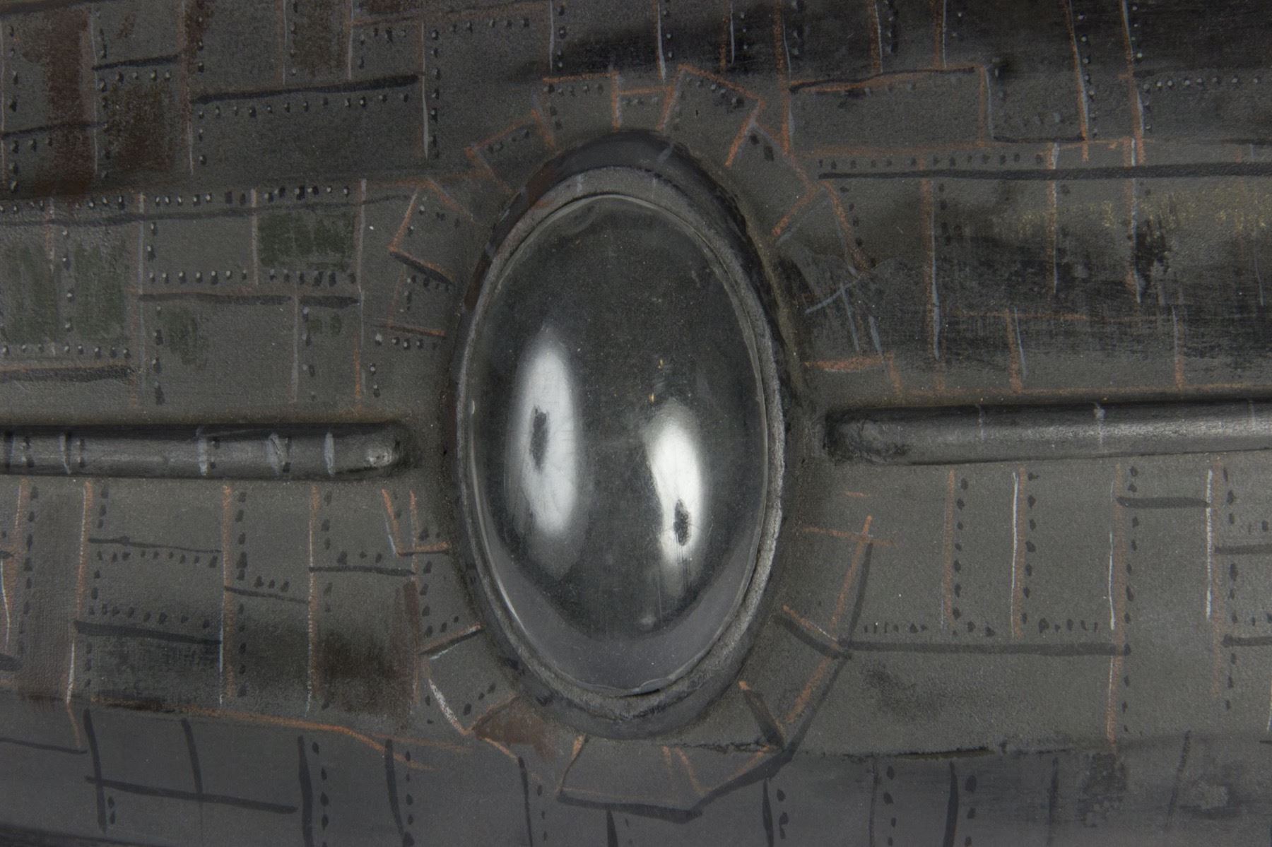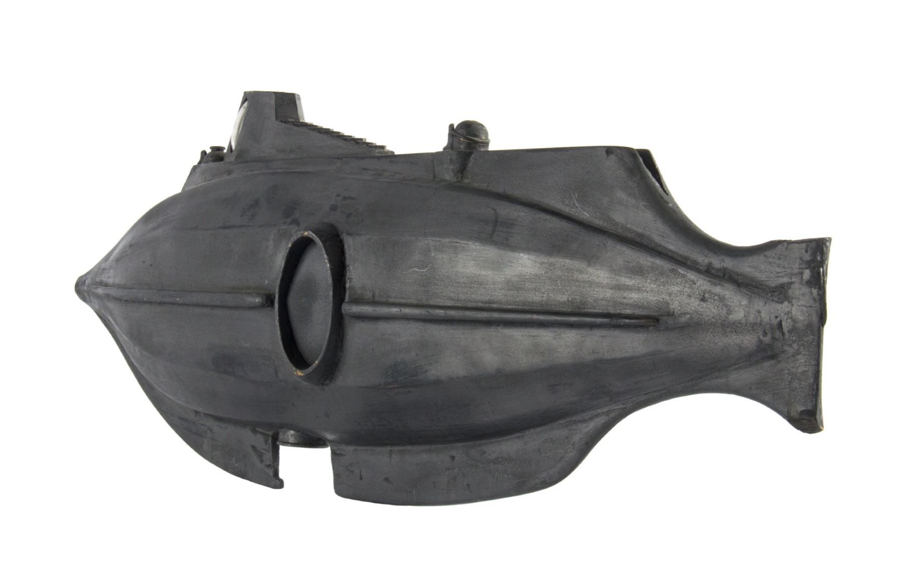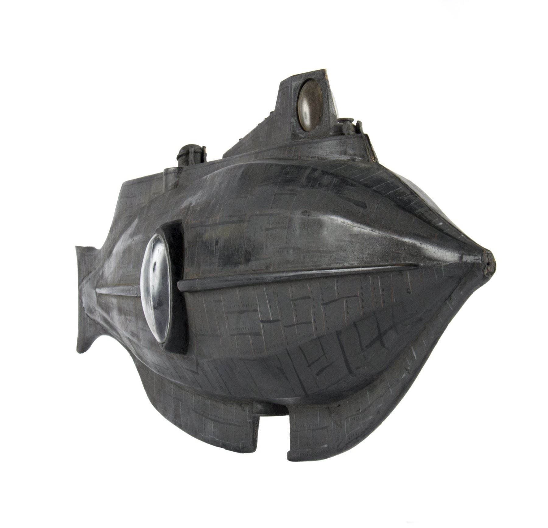 (Disney, c.1953) An extremely rare hand-painted wooden model of the Nautilus from Walt Disney's "20,000 Leagues Under the Sea". This prototype model has been affectionately referred to as the "Anamorphic Nautilus" due to its 'squished' proportions. This model comes from the collection of Harper Goff, who famously designed this rare prototype as a way to solve a unique production issue while filming. At the time, the Studio only had one CinemaScope lens, so Goff devised a way to shoot a 'squished' model using a normal lens that, when projected in CinemaScope, would be 'stretched' to normal proportions. This model of the Nautilus was designed by Goff for those early tests, and photos of this model both before and after the 'stretch' were kept by Goff in his personal scrapbook. It is unclear if this technique was ultimately used in any final scenes in the film, as various interviews with production staff from the film recount that this technique was used, however it is difficult to determine this within the footage itself. Nevertheless, Goff's own accounts of designing this prototype describe details such as the rivets being painted in an oval shape so that they would stretch to become circular, as can be seen in the small painted oval rivets in this model. Measuring approximately 22" long and 9" tall, this model is in fair to good condition with some surface scratches and areas of wear from use and age. There are some portions of the model which are now missing, including the ram and rakers, rudder, and flagpole. This incredibly rare artifact is a wonderfully unique version of the Nautilus and plays an important role in the creation of this iconic film.