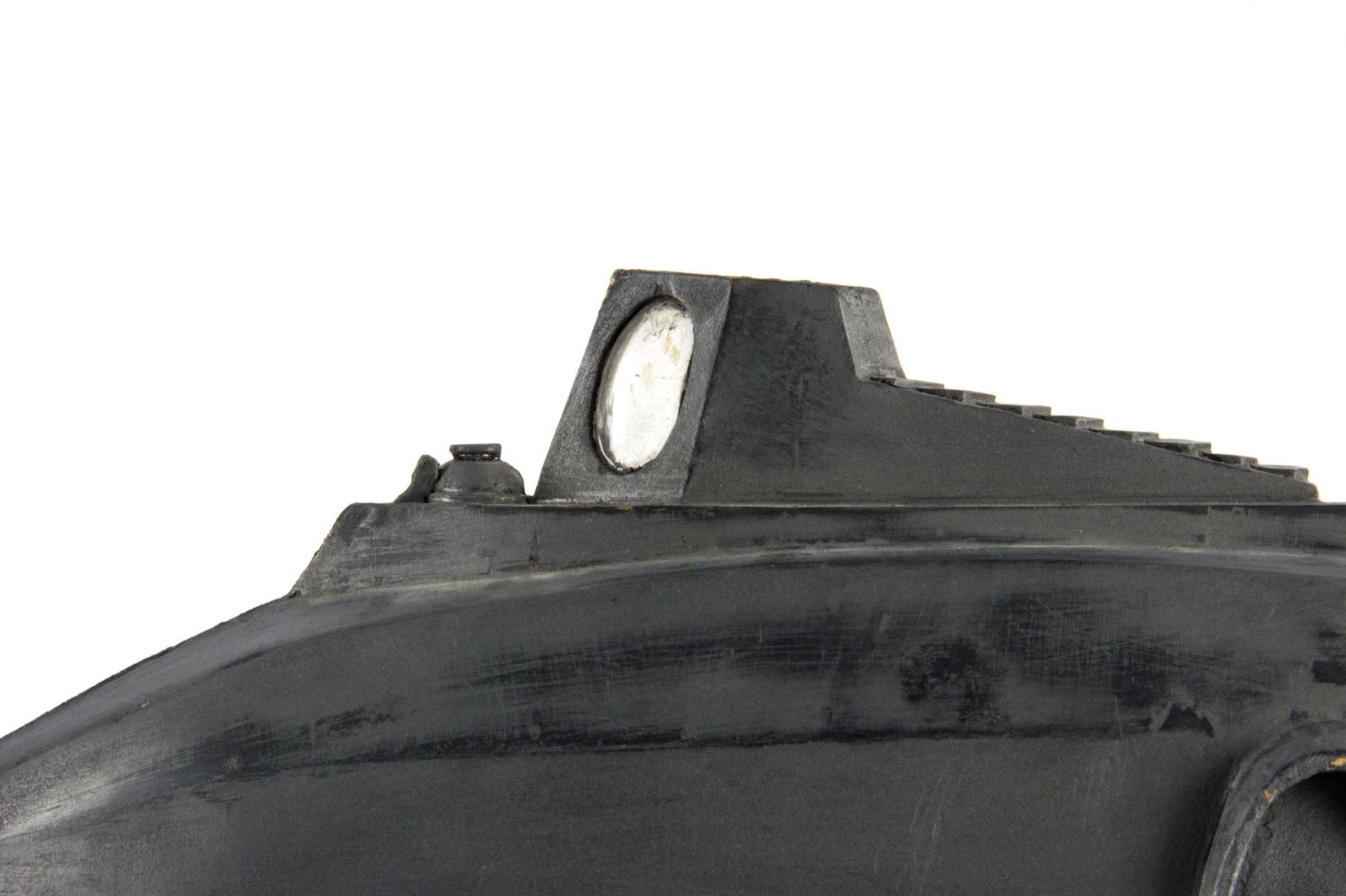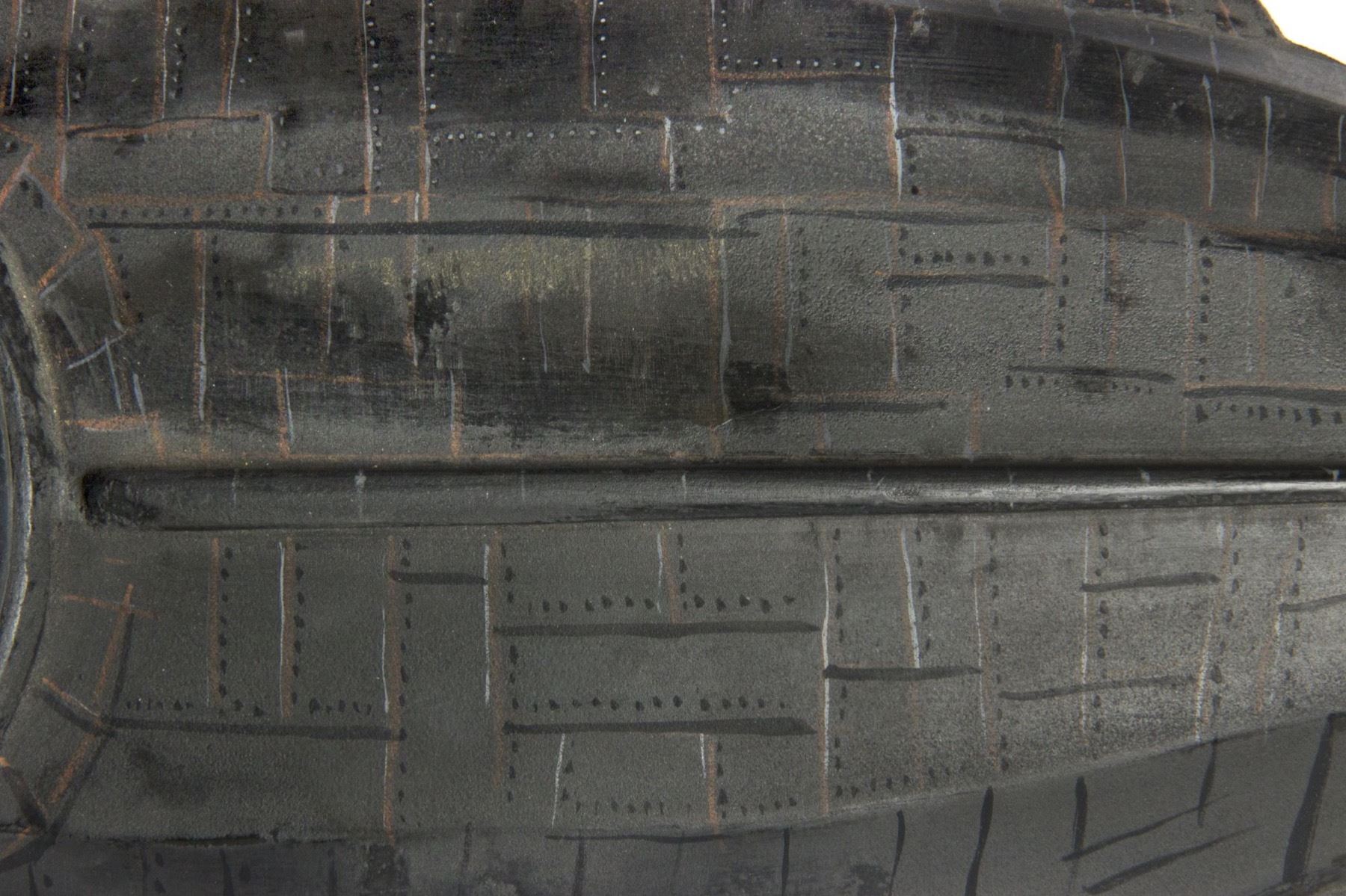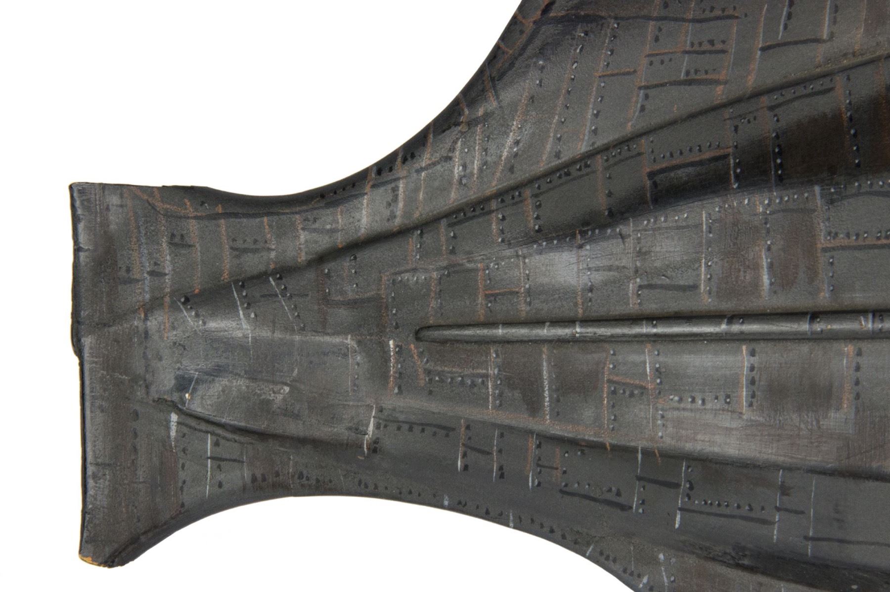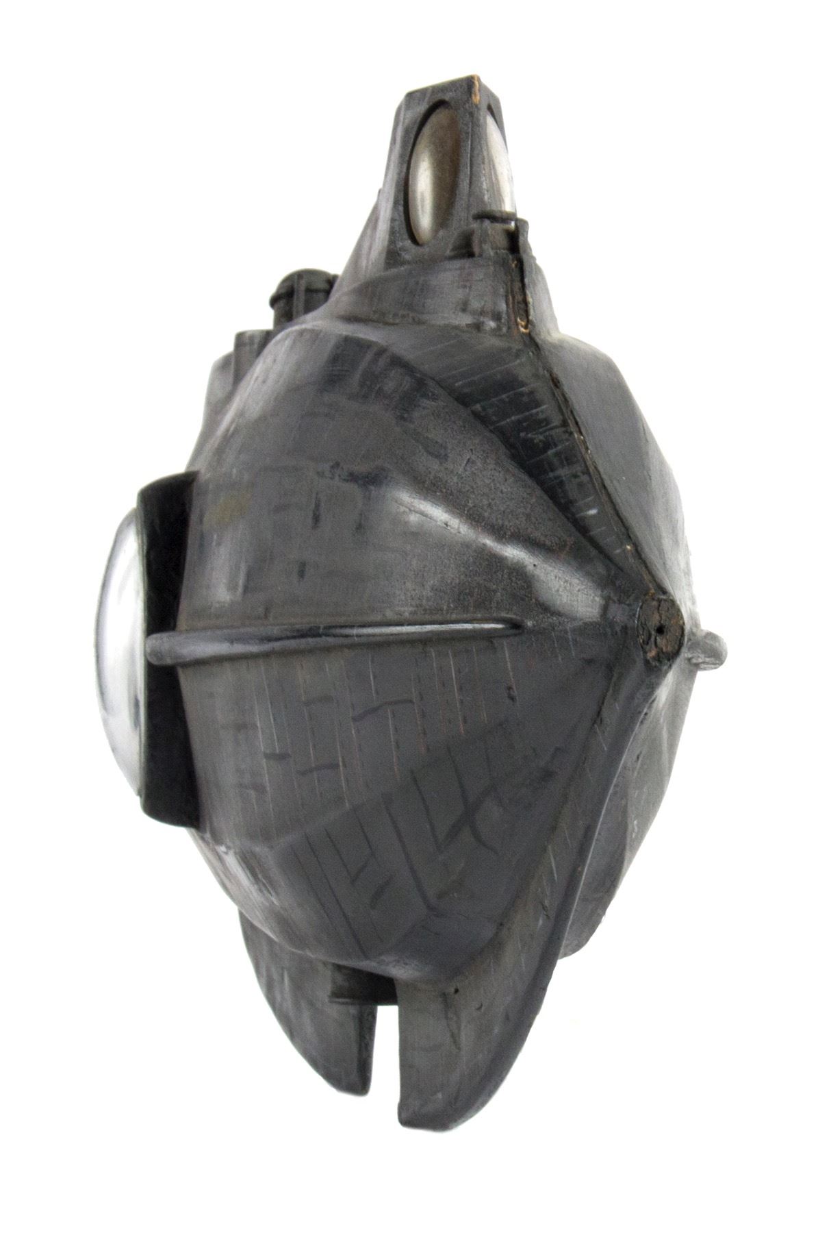 (Disney, c.1953) An extremely rare hand-painted wooden model of the Nautilus from Walt Disney's "20,000 Leagues Under the Sea". This prototype model has been affectionately referred to as the "Anamorphic Nautilus" due to its 'squished' proportions. This model comes from the collection of Harper Goff, who famously designed this rare prototype as a way to solve a unique production issue while filming. At the time, the Studio only had one CinemaScope lens, so Goff devised a way to shoot a 'squished' model using a normal lens that, when projected in CinemaScope, would be 'stretched' to normal proportions. This model of the Nautilus was designed by Goff for those early tests, and photos of this model both before and after the 'stretch' were kept by Goff in his personal scrapbook. It is unclear if this technique was ultimately used in any final scenes in the film, as various interviews with production staff from the film recount that this technique was used, however it is difficult to determine this within the footage itself. Nevertheless, Goff's own accounts of designing this prototype describe details such as the rivets being painted in an oval shape so that they would stretch to become circular, as can be seen in the small painted oval rivets in this model. Measuring approximately 22" long and 9" tall, this model is in fair to good condition with some surface scratches and areas of wear from use and age. There are some portions of the model which are now missing, including the ram and rakers, rudder, and flagpole. This incredibly rare artifact is a wonderfully unique version of the Nautilus and plays an important role in the creation of this iconic film.