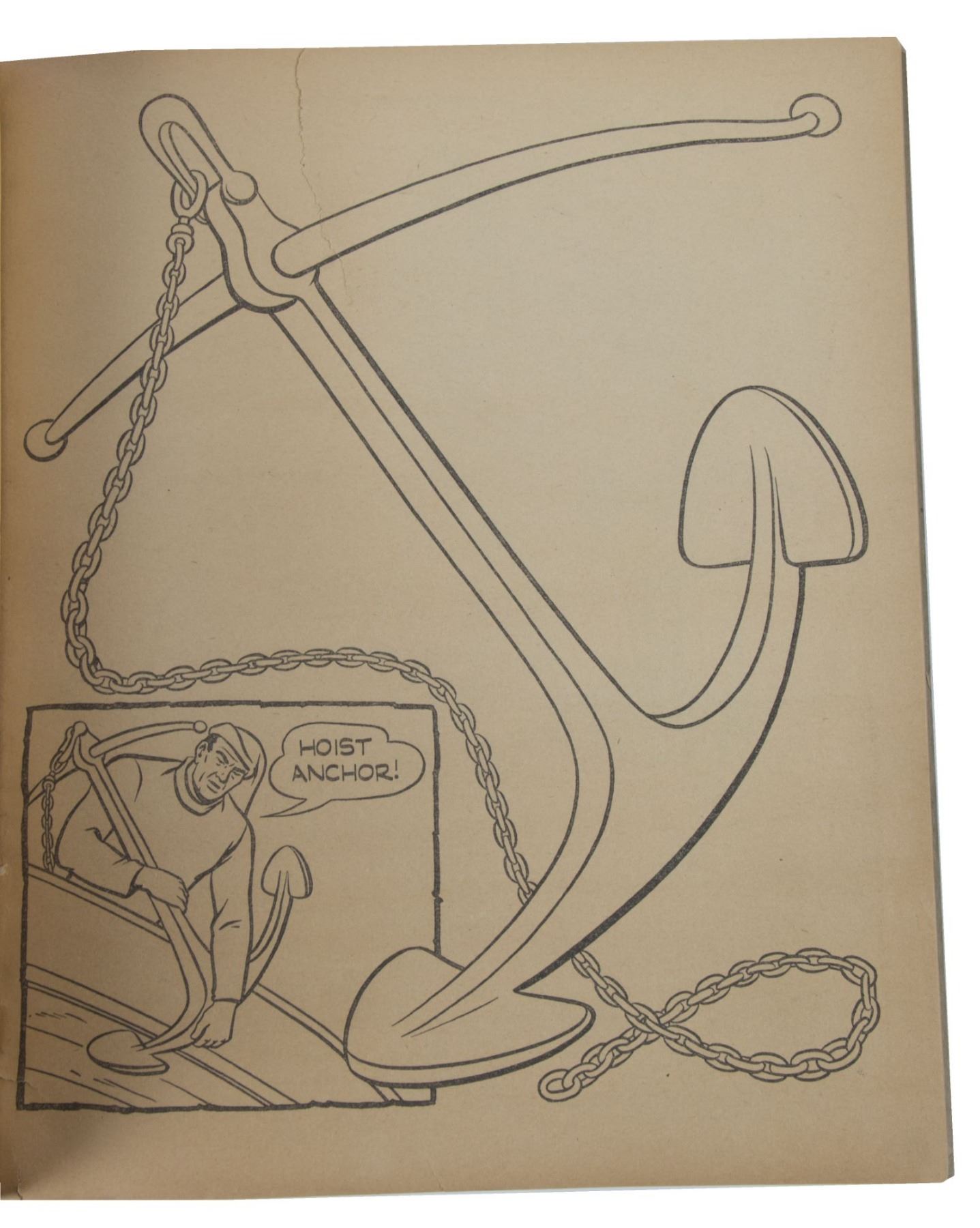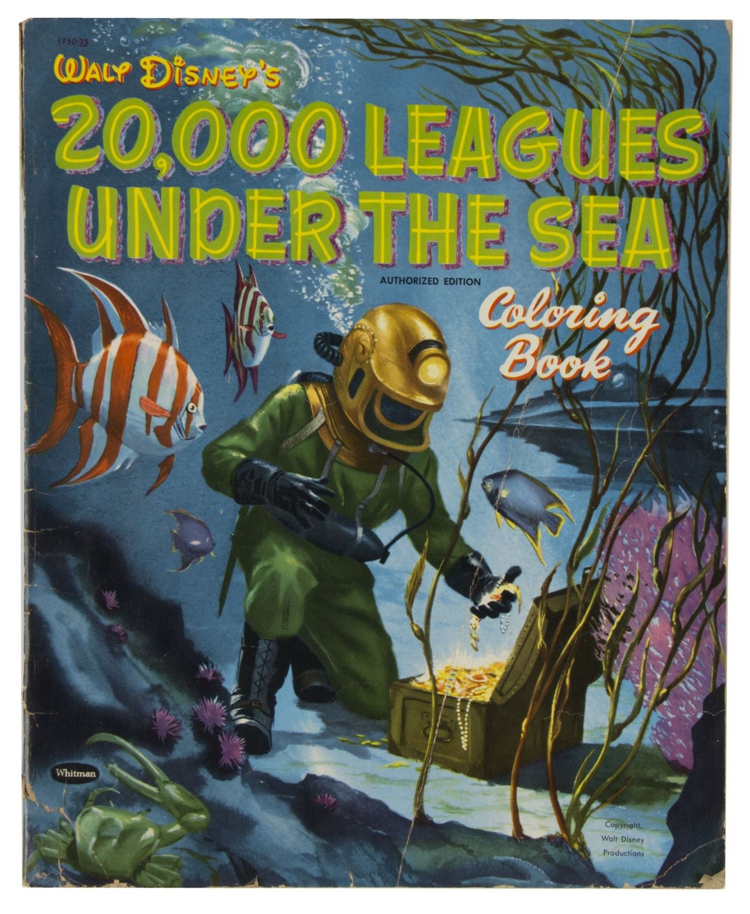 (Whitman, 1954) A promotional coloring book featuring imagery based on Walt Disney's "20,000 Leagues Under the Sea". The 60-page book measures 13.5"x11" and is in fair to good condition with a few of the pages colored and a tear along the top-edge of some of the first few interior pages.