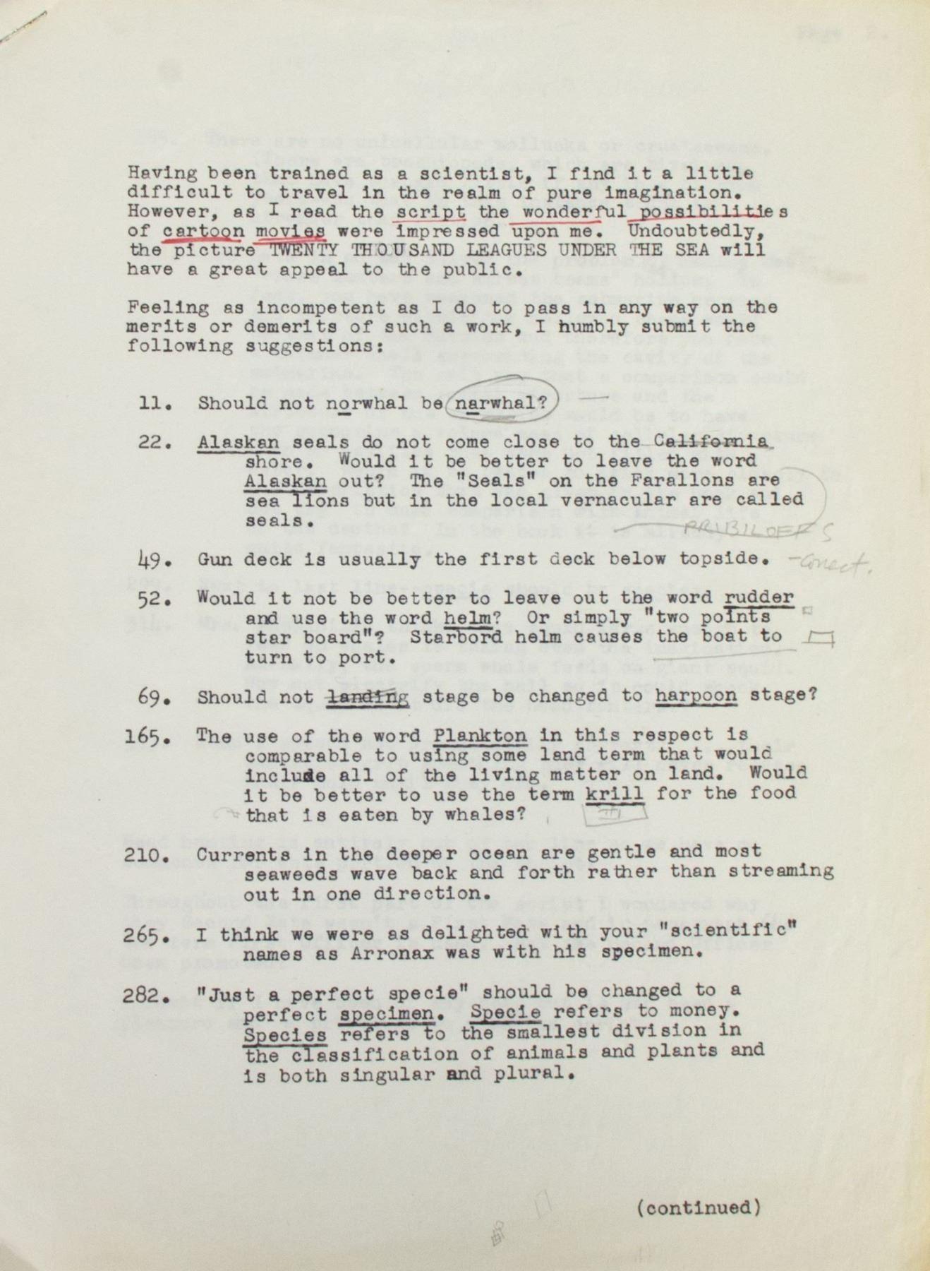 (Disney, c.1953) Two pages of script corrections from the estate of Harper Goff, relating to the original script for Walt Disney's "20,000 Leagues Under the Sea". The studio sent the script to an unnamed scientist so that he could look for factual inaccuracies and recommend changes. The resulting notes describe several factual problems in the script, and remedies. Each page measures 11"x8.5", and the condition is good with some yellowing around the edges and minor wear from use.