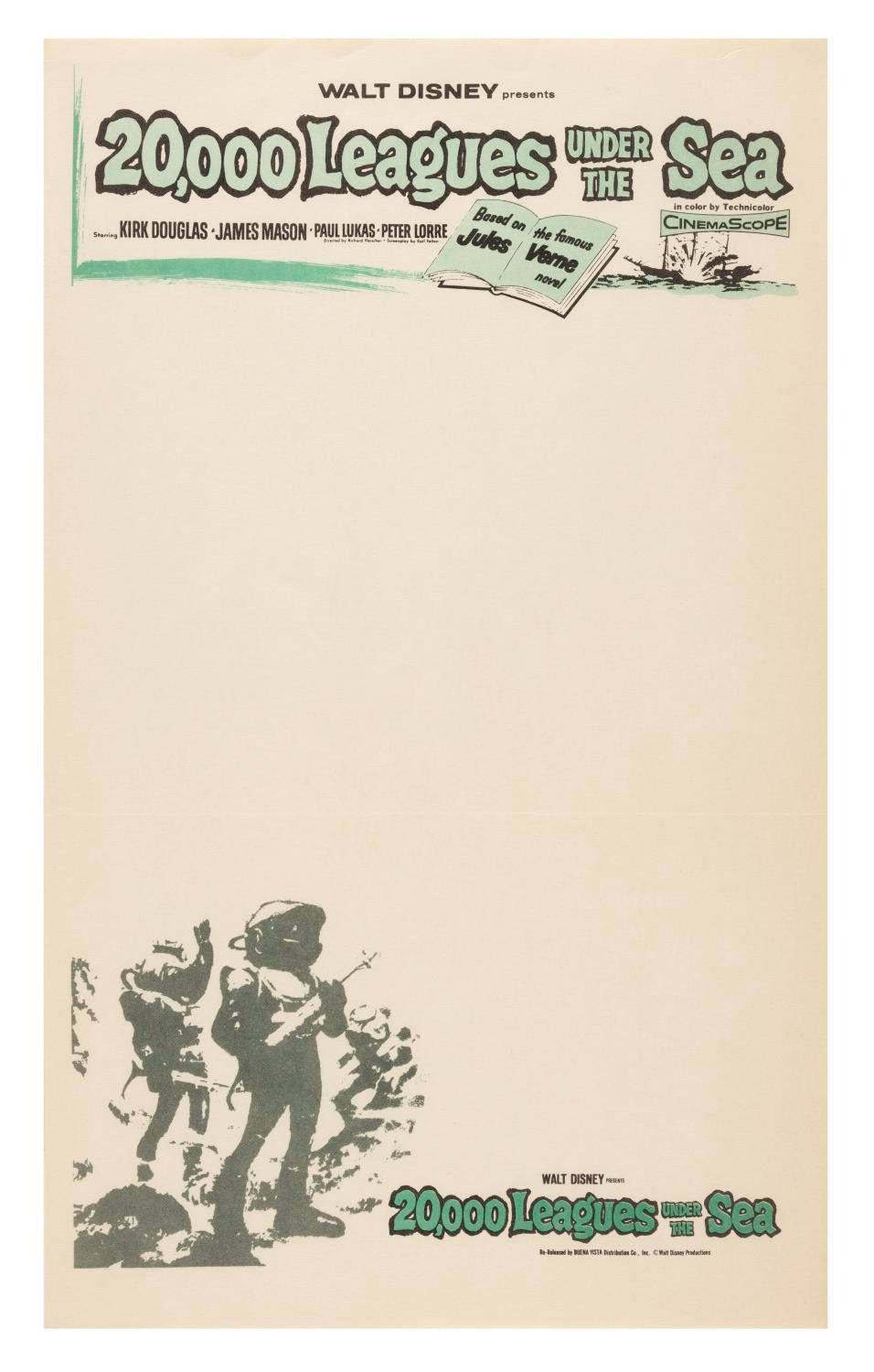 (Disney, 1963) A sheet of Walt Disney Studio stationery promoting the 1963 re-release of "20,000 Leagues Under the Sea." The Studio would often change its stationery to promote upcoming films. Measuring 14” x 8.5”, the sheet is in good condition with light creasing along the top and one horizontal fold along the lower third.