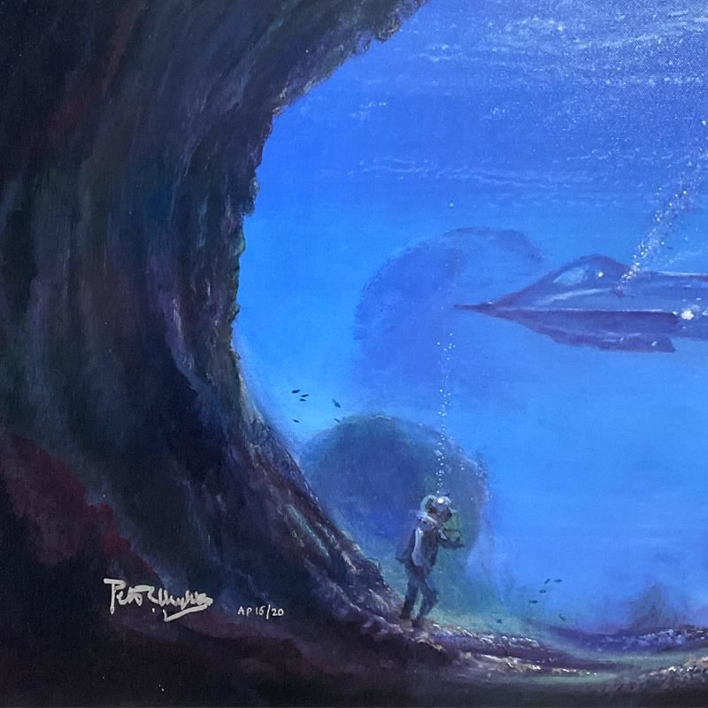 20,000 Leagues is a limited edition giclee on canvas by Peter (1913-2007) and Harrison Ellenshaw, PP numbered 2/5 and hand signed by the artists. This piece is licensed by Disney Fine Art. Includes Letter of Authenticity. Measures approx. 18 x 36 (image). There are faint horizontal striation lines on the bottom-right part of the canvas that is only noticeable upon close inspection. There are also dark ink marks in the bottom-right border that will be concealed when the piece is framed.