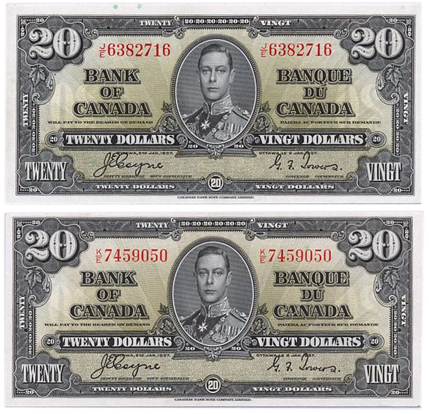 1937 Issue. BC-25c. Coyne-Towers. No. J/E 6382716. No. K/E7459050. Both BCS graded AU-55.