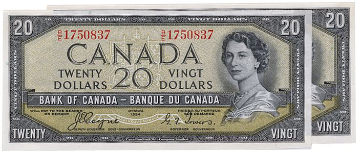 1954 Issue. BC-33a. Coyne-Towers. ‘Devil’s Face’. No. B/E1750837 and B/E1750838. Lot of two (2) consecutive Choice Unc notes with scarcer prefix letters.