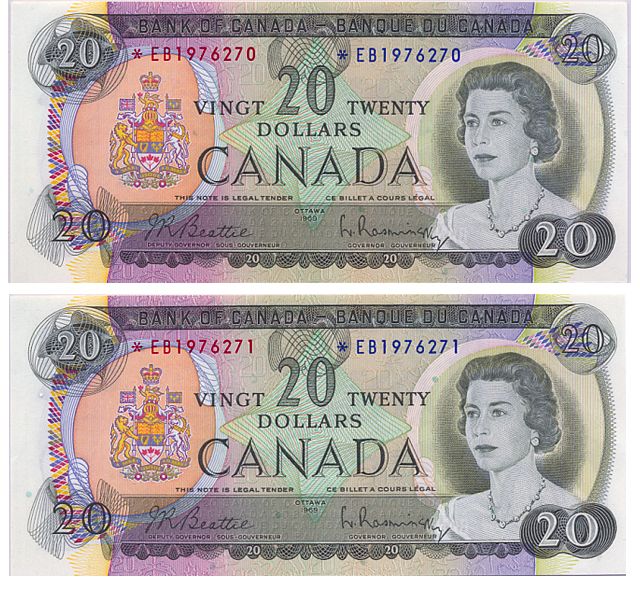 1969 Issue. BC-50aA. Beattie-Rasminsky. No. *EB1976270 & *EB1976271. Both PCGS graded UNC-65 PPQ. Lot of two (2) consecutive gem replacement notes.