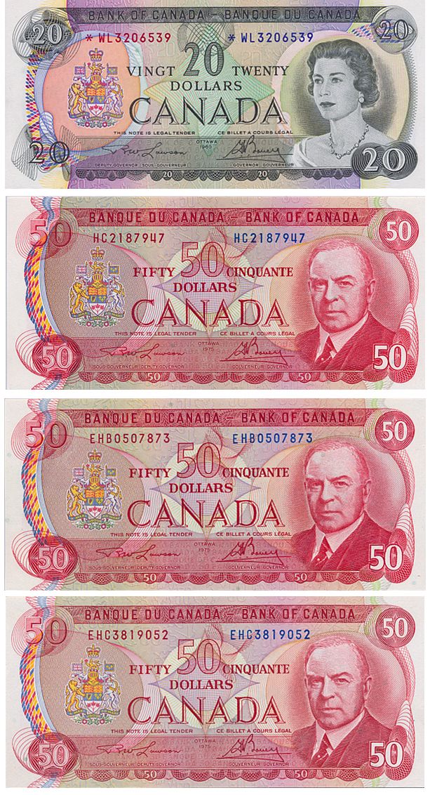 1969 Issue. BC-50bA. Lawson-Bouey. No. *WL3206539. A Replacement. BCS EF-45; $50.00. 1975 Issue. BC-51a. Lawson-Bouey. No. HC2187947. BCS graded AU-55; BC-51a-i. Lawson-Bouey. No. EHB0507873. BCS graded EF-40; No. EHC3819052. BCS graded AU-50. Lot of four (4) notes.