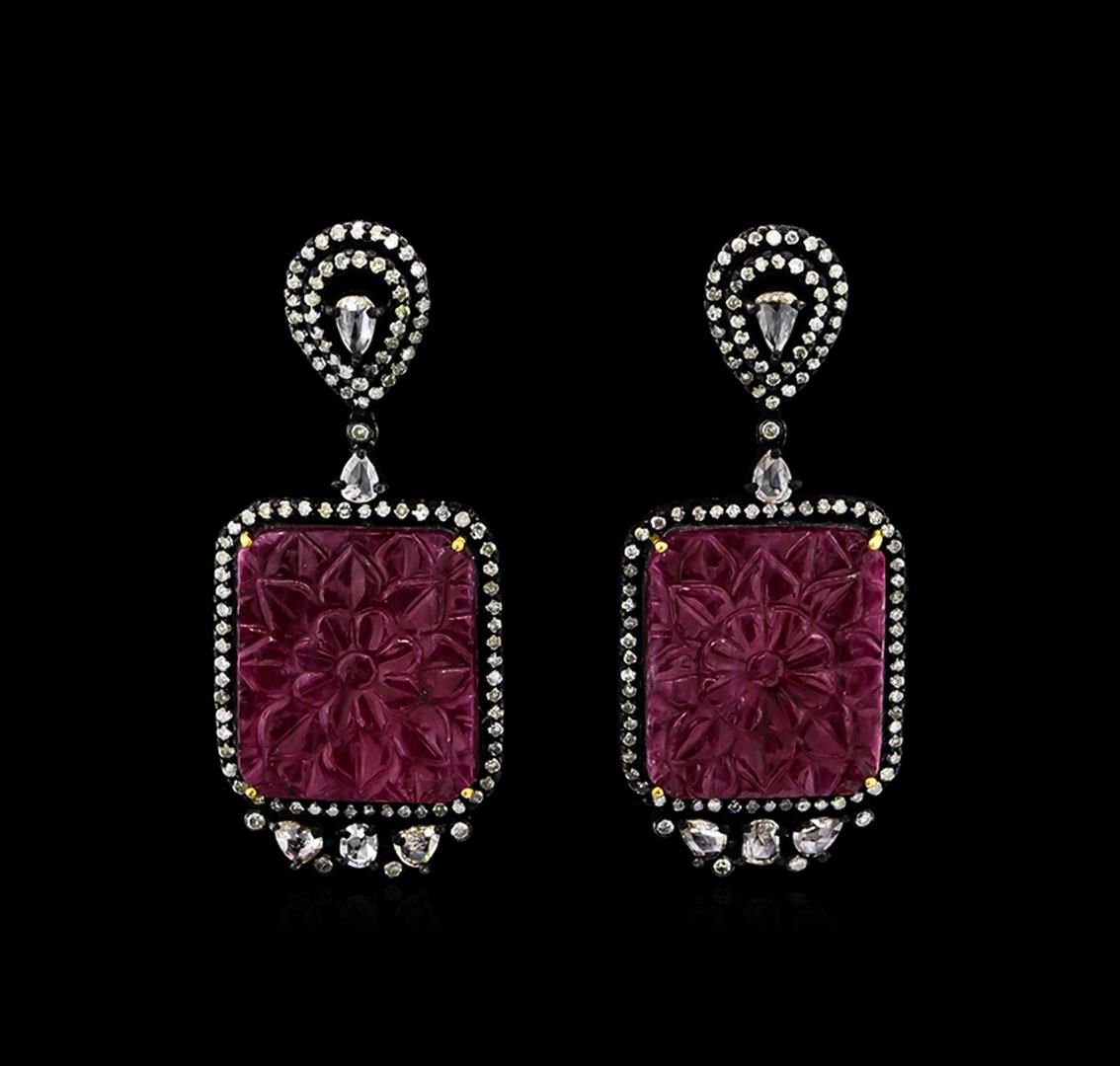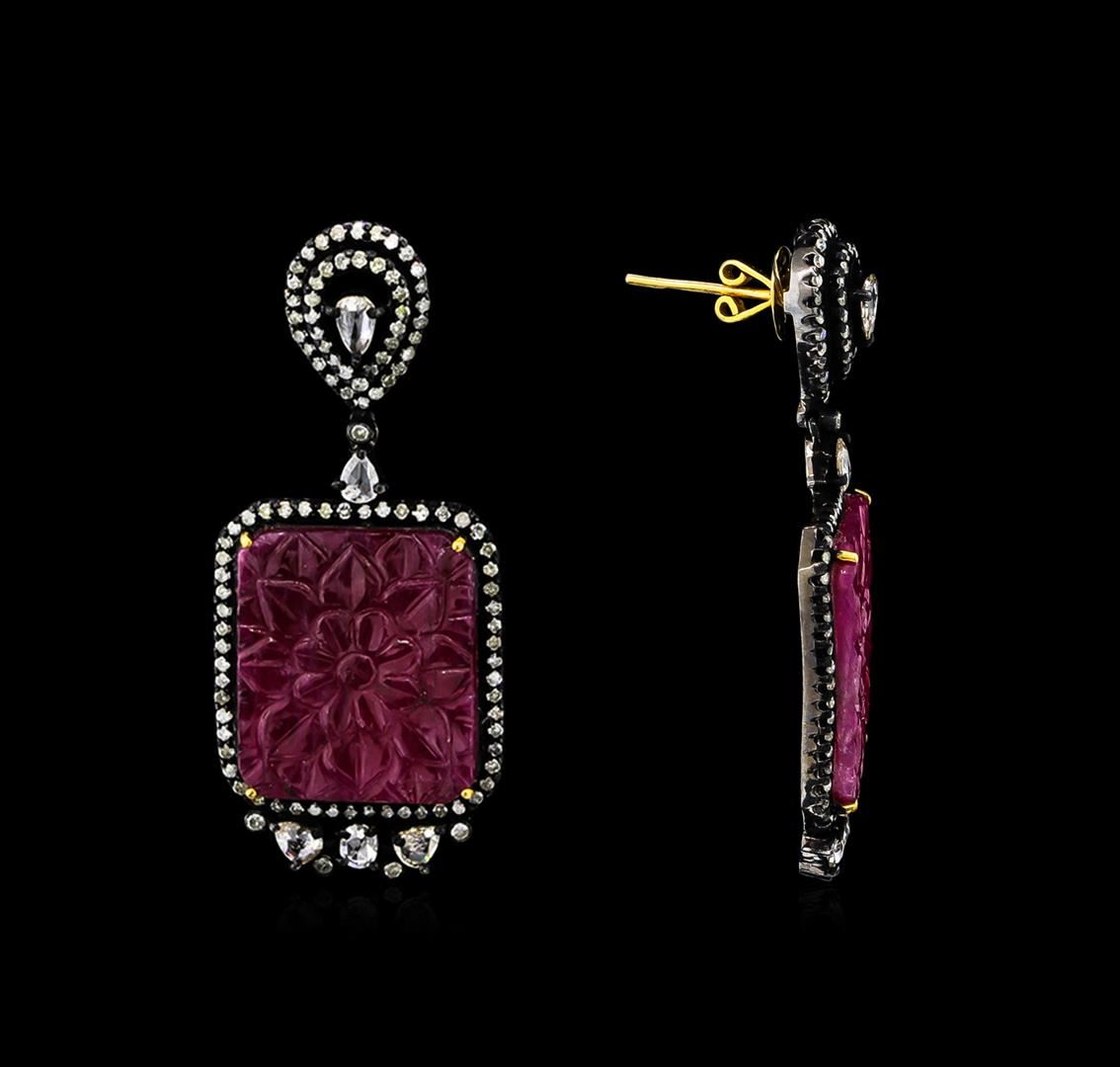 One pair of earrings featuring: 14KT white and yellow gold weighing 12.61 grams containing pink sapphires with a total weight of 20.00ct and diamonds with a total weight of 1.30ct.