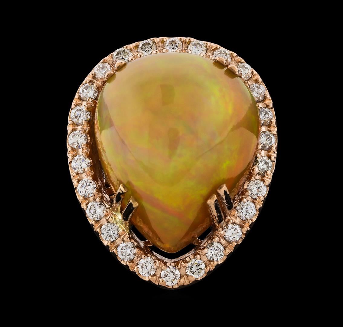 One electronically tested 14KT rose gold lady's cast fashion ring with a split shank halo with a bright polish finish. The featured lady's ring has a shank measuring 2.10 millimeters wide. Identified with markings of '14K'. Condition is new, good workmanship. Containing: One orange crystal that is cut in a pear shaped cabochon and is unset, measuring 20.86 mm long x 17.35 mm wide, and 12.60 mm thick and the approximate weight is 20.05 carats. The opal has a somewhat bright, multicolor play of color (fire) in a rolling flashfire pattern; a high dome; a good cut; no inclusions; consistent in its brightness and pattern; and is not directional. Graded in the setting. Twenty-Six prong set round brilliant cut diamonds, measuring 2.10 - 2.05 x 1.29mm (depth est.) approximate total weight of 26 Stones = 0.88ct. Graded in the setting. Clarity VS-2 to SI-2. Color: H - I Cut Good. Total Weight of Diamonds 0.88ct.. Total Weight of Opals 20.05ct.. Total Weight of Ring 13.20gm. GAS Appraised at $9,070.00.