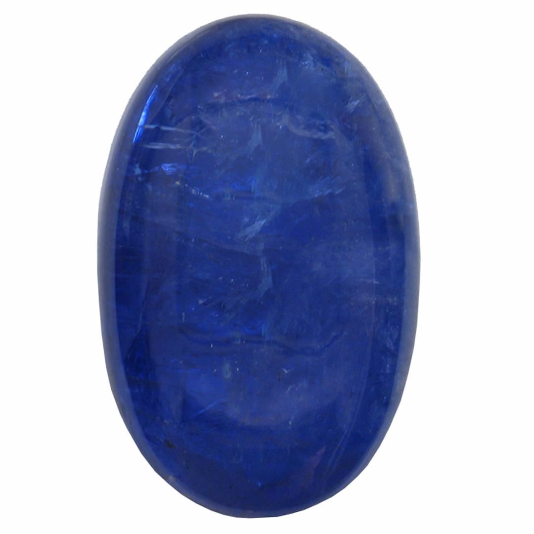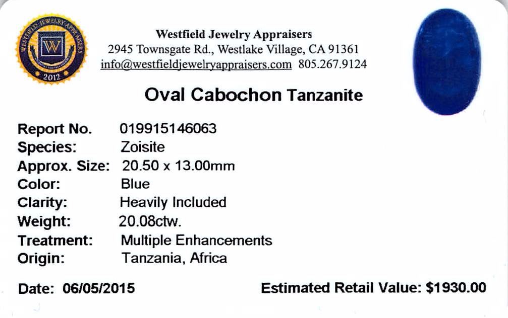 One oval cabochon cut natural tanzanite, measuring 20.50 x 13.00 x 7.00mm, exact weight 20.08ct., clarity is heavily included, type I, dark, very slightly grayish, blue color, (GIA B 7/3), cut is good. Transmitting light somewhat diffusely, transparent to translucent. Naturally occurring internal & external characteristics are present. Indications of heat treatment. Westfield Appraised at $1,930.00.
