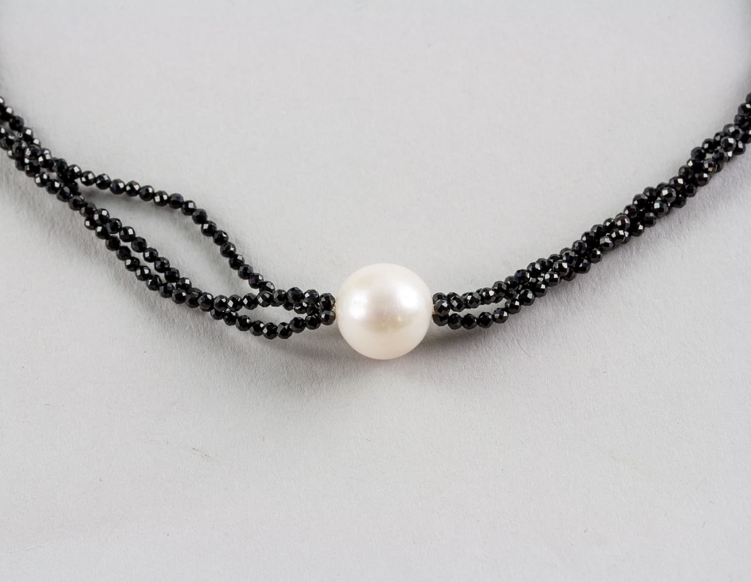 Stamped 925 silver clasp necklace. Set with 20.0ct modified briolette cut, black colored freshwater pearl and spinel. Certified replacement value $1010. 9.85 grams.
