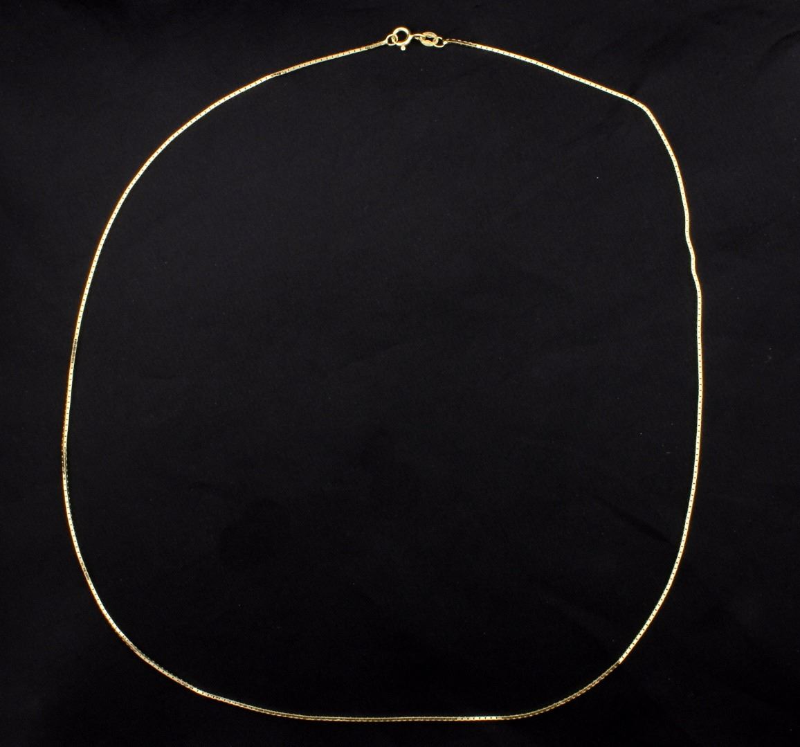 The chain is 14K yellow gold and is .8mm thick, it has a lobster clasp. 3.2g